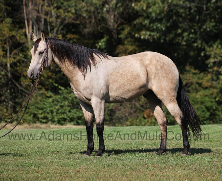 This horse sells in Cannon Falls, MN on February 1st and is consigned to www.NorthStarHorseSale.com you can bid online, bid in person and come preview each horse and ride them yourself before bidding. Shipping is available anywhere in the USA. $5000 starting bid, all horses sell sound. Jewell’s Pardee is the life of the party and will be the center of attention! With his high contrast buckskin coloring, pretty dapples and personality he sparks folk’1s attention from all angles! Pardee is a well built 15.3hh, 2020 model, registered APHA, Buckskin Gelding. His name might suggest that he’s just here for a good time but he knows how to go to a job and how to get it done the right way! Pardee can do anything from slow easy trail rides packing saddle bags full of beverages to pasture roping/doctoring, he can push the cows around and hold anything that you tie to the horn. If you want to come out of the box, Pardee knows how to turn a steer and has a done good roping on the head side. If you just want to enjoy those long slow miles on the trails with your friends, Pardee can babysit anyone in the family as he is perfectly content to just mosey along slow and easy. He will cross creeks, deadfall, rough rocky areas and scale steep slopes. Pardee is one hand broke, he reins around with ease, has a big stop and lopes very nice circles on the correct lead. Pardee is easy to ride and is safe for all levels whether you use him daily or once a month. Climb on, set back and enjoy this Pardee! Feel free to call Eric 606-308-2461 with any questions.