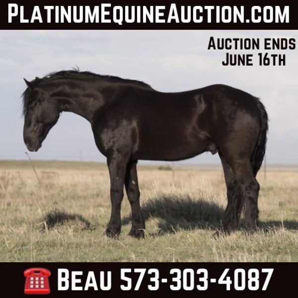 ONLINE AUCTION Place your bids at www.PlatinumEquineAuction.com Starting Bid $3500 Auction ends June 16th, 2024 Need a new saddle? Check out White Rock Saddles on our website or Facebook! Cash is a striking 4-year-old Friesian gelding standing at 16.2 hands tall. With a sleek, black coat that glistens in the sunlight, Cash commands attention wherever he goes. His gentle, expressive eyes reveal a curious and intelligent nature, eager to explore new trails and adventures. Having been extensively trail ridden, Cash is a seasoned explorer, confidently navigating through varied terrain with grace. Not only is cash a seasoned trail companion, but he is also proficient in the art of driving. His powerful build and sturdy frame make him a natural fit for harness work, whether pulling a carriage or navigating the open road. With a calm demeanor and responsive cues, Cash is a joy to drive, effortlessly maneuvering through obstacles with precision and finesse. Whether under saddle or in harness, Cash’s versatility and gentle disposition make him a cherished partner for riders and drivers alike. In addition to his impressive skills, Cash possesses a warm and affectionate personality, forming strong bonds with those who earn his trust. His gentle nature and eager-to-please attitude make him a favorite among riders and handlers alike. Cash does great in a stall or out on pasture and gets along great with other horses. Cash sells sound. For more info call or text Beau Slaughter 573-303-4087. Cash can be picked up or previewed at either of our ranch locations in Canyon, TX or Sweet Springs, MO. ONLINE AUCTION Place your bids at www.PlatinumEquineAuction.com Starting Bid $3500 Auction ends June 16th, 2024 Need a new saddle? Check out White Rock Saddles on our website or Facebook!