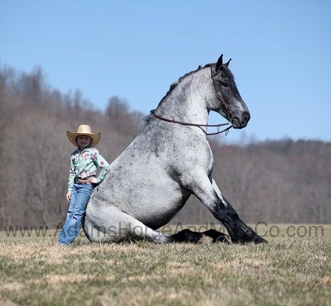 Go to visit our website for more pics and a video. AHAMC has been in the horse business and sold horses over the internet since 2005. We have a long track record of success with hundreds of happy customers. We work hard to match riders with the correct horses and specialize in beginner safe, family friendly horses that have been used and checked out by our family! We can set up transportation anywhere in the US and look forward to working with you.Prince is as cool as any horse that you will see! He is a true blue roan draftcross that stands 16.2hh that will weigh around 1400lbs and he is a 5 years old. Prince is certainly an attractive fellow but there is a lot more to him than what meets the eye! Prince is everyone’s best friend as he loves attention and is very calm natured. Prince is out of the same breeding program as several other top draftcross geldings that we have had over the last 5 years and every one of them has the right mind with the calm nature that makes them great family horses. We have got Prince started on learning some tricks such as to lay down and set. Prince has been ridden by every member of our family all the way down to our 6 year old daughter. He has been ridden down the highways and he is traffic safe as well. Prince is great on trails and he will cross creeks, ditches, logs and navigate rough rocky areas. He has a smooth jog, a VERY VERY nice easy to set lope and a good stop! He has been exposed to all kinds of wildlife such as deer or turkey or other animals like cows or dogs and will go anywhere that he is asked too. He has been rode many miles in the mountains of Eastern Kentucky and encountered every obstacle possible on the trail. He will go up or down even the steepest slopes, across deep creeks, over downed trees, and over all types of rough terrain while still being sure footed. Prince is not cinchy, cold backed, does not crib or weave. In addition to riding, Prince has also been worked around the farm as well. Prince is a rare find that anyone is lucky to have!!! Feel free to call Eric 606-308-2461 with any questions. Go to visit our website for more pics and a video. AHAMC has been in the horse business and sold horses over the internet since 2005. We have a long track record of success with hundreds of happy customers. We work hard to match riders with the correct horses and specialize in beginner safe, family friendly horses that have been used and checked out by our family! We can set up transportation anywhere in the US and look forward to working with you.
