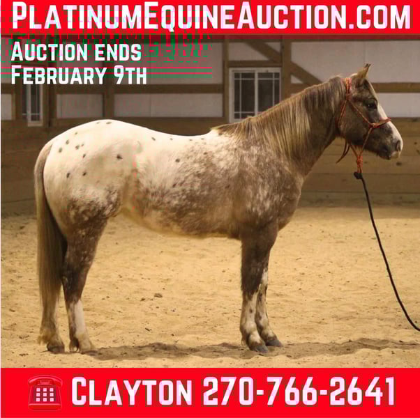 ONLINE AUCTION Place your bids at www.PlatinumEquineAuction.com Starting Bid $3500 Auction ends February 9th, 2025 Need a new saddle? Check out White Rock Saddles on our website or Facebook! Peanut is a 14.2 hand Appaloosa gelding that is built like a little tank! He has lots of conformation to him! Peanut is 6 years old! We have used this little horse out on the trails a ton. He is very laid back and loves the woods! He will go up and down the hills with no problems! He will play in the creek and will stand still while you’re out on the trail taking a break! Peanut has been ridden mostly by a 15 year old girl and she enjoys him very much! He will walk, trot, canter in an arena and he knows his leads! His canter is a little fast at first but he will slow down after the first minute or so! He loves to walk around gentle is his favorite speed but will get up and go fast when asked! He has been ridden around cattle as well! He has checked fences mostly but has also been used to gather cattle and load trucks! He does all the obstacles in the barn and has a lot of ride to him! He will neck rein, back up, and side pass when called upon! Peanut has also been ridden and handled by younger children quite a bit! We feel like peanut would be best suited for a rider that has some confidence because he has some buttons and is well broke! He is a super nice smaller gelding that is the right size for just about anyone! He does well kept in a stall or out on pasture! He is an easy keeper and stays fat year around! If you are looking for a gelding that is good size to get on and off of and that will get you noticed anywhere then he is your guy! We think he is the coolest colored and the most fun horse to ride in the barn! He is sound and has no vices! He is located in Sonora Ky! Feel free to call Clayton Ryan 270-766-2641 with any more questions or concerns! Buy with confidence on this unique horse! ONLINE AUCTION Place your bids at www.PlatinumEquineAuction.com Starting Bid $3500 Auction ends February 9th, 2025 Need a new saddle? Check out White Rock Saddles on our website or Facebook!
