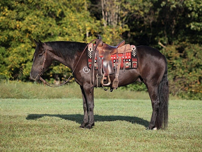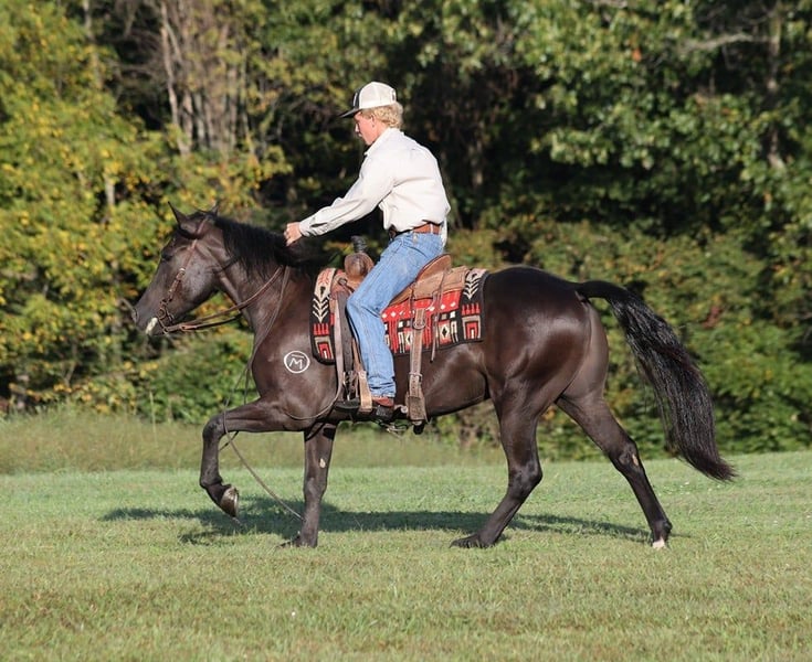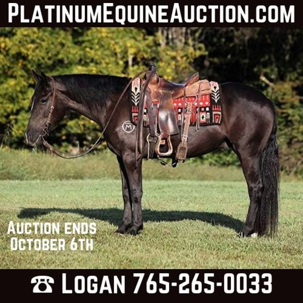 ONLINE AUCTION Place your bids at www.PlatinumEquineAuction.com Starting Bid $3500 Auction ends October 6th, 2024 Need a new saddle? Check out White Rock Saddles on our website or Facebook! Batman is a jet black quarter horse cross gelding standing around 14.3hh and he is 6 years old. He is one classy looking guy! Not only does he look classy, he is has all of the other boxes checked as well… he is Mr. Personality, as friendly as they come, loves attention and is very calm natured. Batman has that calm nature that makes him a great family horse and he is a horse that anyone will get along with. Batman has been ridden by every member of our family and he is safe! He has been ridden down the highways and he is traffic safe as well. Batman is great on trails and he will cross creeks, ditches, logs and navigate rough rocky areas. He has a smooth jog, a VERY VERY nice easy to set lope, a good stop, turns a circle both ways and backs with ease! He has been exposed to all kinds of wildlife such as deer or turkey or other animals like cows or dogs and will go anywhere that he is asked too. He has been rode many miles in the mountains of Eastern Kentucky and encountered every obstacle possible on the trail. He will go up or down even the steepest slopes, across deep creeks, over downed trees, and over all types of rough terrain while still being sure footed. Batman is not cinchy, cold backed, does not crib or weave. Batman is a super cool horse that anyone is sure to love!!! Feel free to call Moore Trained Horses Logan 765-265-0033 with any questions. ONLINE AUCTION Place your bids at www.PlatinumEquineAuction.com Starting Bid $3500 Auction ends October 6th, 2024 Need a new saddle? Check out White Rock Saddles on our website or Facebook! ONLINE AUCTION Place your bids at www.PlatinumEquineAuction.com Starting Bid $3500 Auction ends October 6th, 2024 Need a new saddle? Check out White Rock Saddles on our website or Facebook!