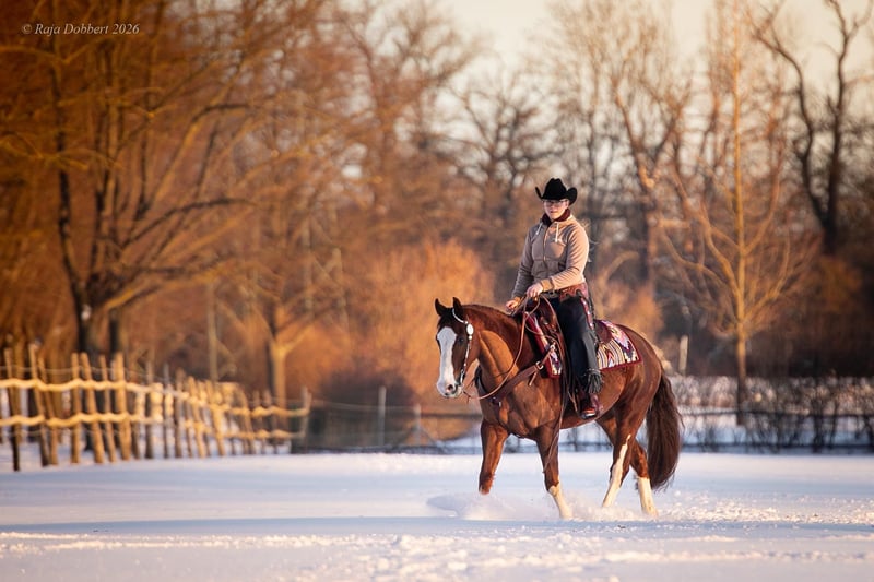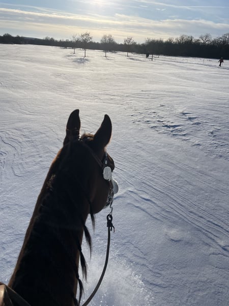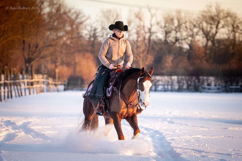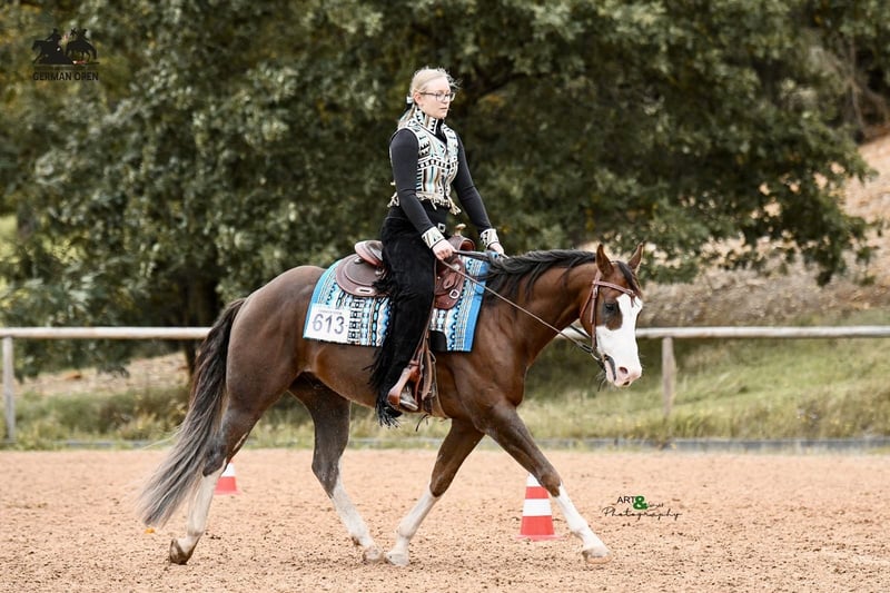 Carli ist 2019 geboren und doppelt registriert (Quarter & Paint Horse). Sein Stockmaß ist 1,52m. Die Abstammung ist im letzten Bild zu sehen. Er wurde 3 jährig kastriert, damit er im Pensionsstall in Gruppenhaltung leben kann. Er ist ein talentiertes und motiviertes Pferd mit guten Bewegungen. Allerdings braucht er dafür einen sicheren und erfahrenen Reiter. Er hat eine gute Grundausbildung in den Disziplinen Ranch Riding, Reining, Trail und Showmanship. Er ist ebenso in der Horsemanship platziert gewesen. Im Gelände ist er brav und durch kein Gefährt zu beeindrucken. Auch Ausritte mit Hund in Begleitung sind für ihn eine willkommene Abwechslung. Den täglichen Umgang mit dem Menschen und Hund ist er gewöhnt. Er läuft barhuf und wurde bisher nur für die Reining beschlagen. Man kann ihn zuverlässig allein verladen, da er durch Schicken unkompliziert in den Anhänger geht. Dadurch waren wir viel zu Kursen unterwegs. Auf fremden Anlagen ist er brav und steht ruhig in der Box oder auf dem Paddock. Carli hat eine 1A große AKU mit Röntgenbildern von 12/2021, die gerne auf Wunsch wiederholt werden kann. Er wurde regelmäßig (turnierkonform) geimpft und bekam jährlich die Zähne gemacht. In der Herde ist Carli ein rangniedriges Pferd, weshalb wir eine Boxenhaltung oder Offenstallhaltung zu zweit / dritt für ihn empfehlen. Er wird verkauft, da er leider für die großen Shows nicht die notwendigen Nerven mitbringt. Wir wünschen uns für ihn einen ambitionierten Freizeitreiter, der Feingefühl und Geduld besitzt. Platz vor Preis 14.900€ VB Bei ernsthaftem Interesse ist ein Probereiten erwünscht und besteht die Möglichkeit Videos per WhatsApp zu bekommen. Ich bitte von Anfragen wie „Was ist der letzte Preis?“ oder „Reittourismus“ -> Probereiten ohne Kaufabsicht abzusehen.