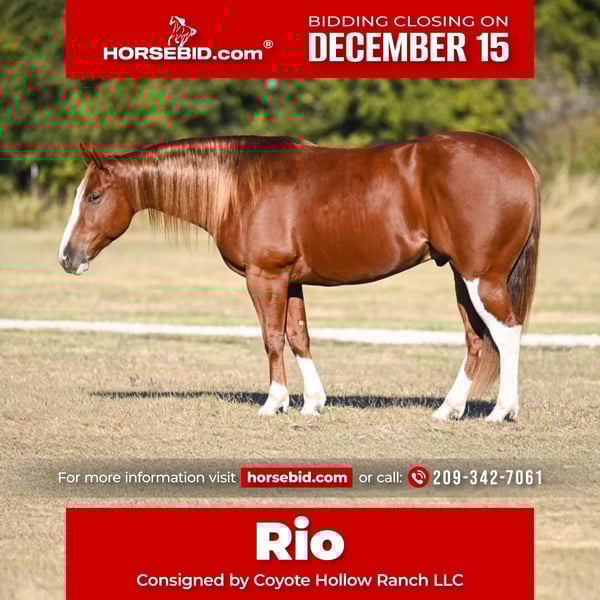 🎄𝐓𝐇𝐄 𝑯𝒐𝒍𝒊𝒅𝒂𝒚 𝐂𝐋𝐀𝐒𝐒𝐈𝐂🎄 Happening now thru MONDAY | DECEMBER 15th - Available EXCLUSIVELY on HorseBid's website! For more details and to register visit: www.Horsebid.com CONSIGNOR CONTACT: Coyote Hollow Ranch LLC 209-342-7061 LOCATION: Waco, TX BREED: Quarter Horse REGISTERED: No REGISTERED NAME: Rio COLOR: Sorrel HEIGHT: 14.3 AGE: 6 GENDER: Gelding If you’re looking for a young gelding with eye appeal, a good mind, and a real foundation, Rio checks every box. This 6-year-old standout has been in a legit program for over a year, including 6+ months with a professional rope-horse trainer. He’s ready to be hauled on the heel side—scores great, has plenty of run and rate, reads cattle naturally, and finds the corner with ease. He’s the same horse every trip and stays honest. Rio is a true ranch hand’s horse as well. He’s been used outside doctoring cattle and handles all aspects of ranch work with confidence. Solid, safe, and 110% sound in every way. With his ride, feel, and demeanor, he would excel in ranch riding and versatility classes. This gelding is as good on the ground as he is under saddle—friendly, willing, and great to be around. Good to saddle, tie, bathe Loads and hauls like a seasoned horse Flashy, broke, and ready to go on with If you’re wanting one that’s been in the right hands, has the foundation, and is ready to step up, Rio is your guy. ✨ Come try him—you’ll like him