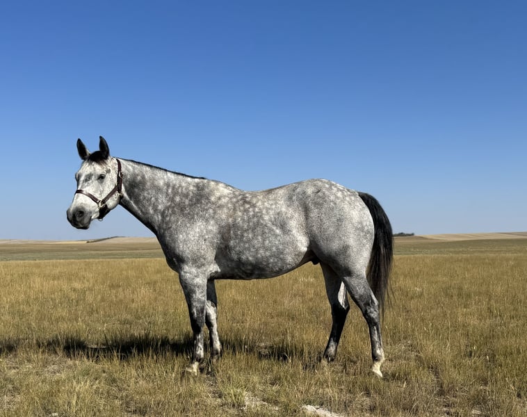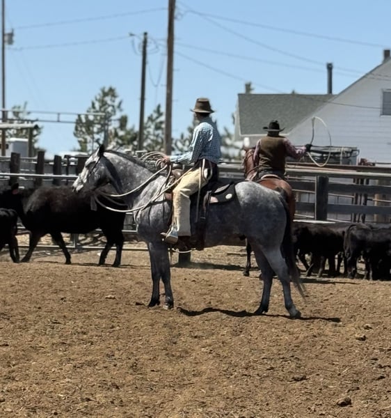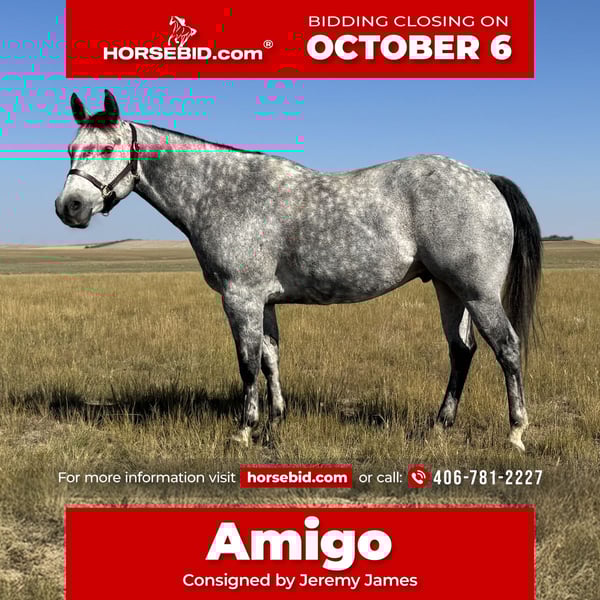 🍂 𝓐𝓾𝓽𝓾𝓶𝓷 𝑨𝑳𝑳 𝑺𝑻𝑨𝑹 𝑳𝑰𝑵𝑬𝑼𝑷 🍂 Happening now thru MONDAY | OCTOBER 6th - Available EXCLUSIVELY on HorseBid's website! For more details and to register visit: www.Horsebid.com CONSIGNOR CONTACT: Jeremy James 406-781-2227 LOCATION: Power, MT BREED: AQHA REGISTERED: Yes REGISTERED NAME: ROLLING ROYAL COL COLOR: Gray HEIGHT: 15 AGE: 6 GENDER: Gelding ROLLING ROYAL COL Meet “Amigo”. He is a 2019 AQHA gelding, standing at 15 hands. Amigo is quiet minded, eager to please and reliable in any situation. He’s an honest heart and has the ability to boost the confidence of any beginner or timid rider. He has been ridden by young and old riders alike and he always takes care of his “person”. He is very patient, especially with youth riders just starting out. If it’s learning to ride or learning to rope, Amigo is solid and steady. Even if you just need a “babysitter” for a while, he definitely fits the bill. I honestly can’t say enough good things about Amigo. Amigo is also steady and solid for your intermediate and advanced riders. He’s a great cow horse - ropes, sorts, side passes, doctors out in the pasture, opens gates and handles himself well under pressure in and out of the working pen. No challenge is too big for this boy. You can rope about anything - he knows his job. He’s a great partner at whatever task you set out to accomplish Amigo travels on any sort of terrain. He pushes cattle and a band of horses almost everyday on the ranch. He doesn’t barn or buddy sour, and rides off alone without hesitation. Amigo is use to cow dogs at his heels, and doesn’t get bothered by things along the way. He is the easiest to catch in any pen or pasture. He stands quiet for everything from grooming to saddling to shoeing. He definitely loves attention and the occasional treat! Amigo checks all the boxes as a great all-around dependable ranch and family horse who’s had lots of great experience. Amigo will be your lifelong buddy. Amigo is located in Power, MT - we are happy to help you get in contact with transport services for around the country. For more information call Melissa or Jeremy James at 406-781-2227.