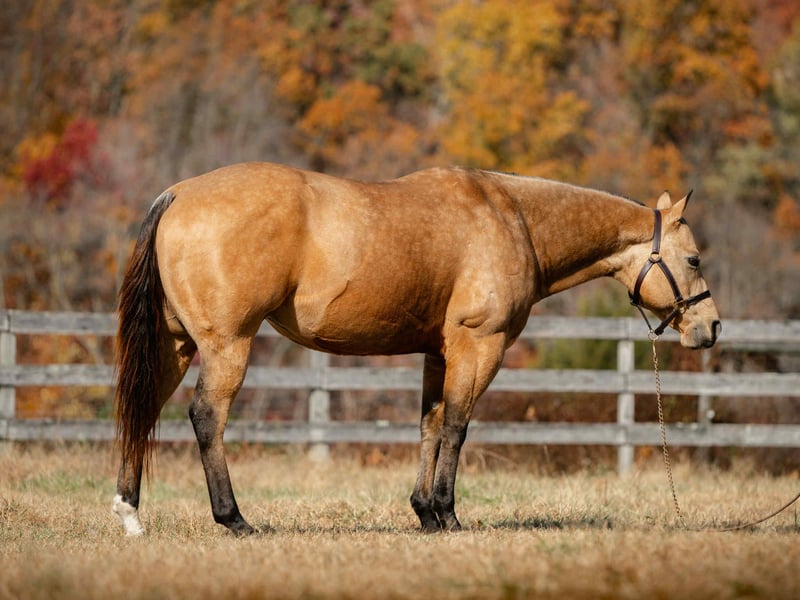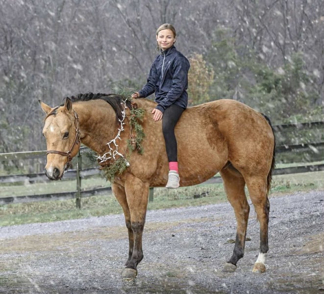 ⚜️ 𝓗𝓮𝓻𝓲𝓽𝓪𝓰𝓮 𝐖𝐢𝐧𝐭𝐞𝐫 𝓒𝓵𝓪𝓼𝓼𝓲𝓬⚜️ Happening now thru MONDAY | DECEMBER 29th - Available EXCLUSIVELY on HorseBid's website! For more details and to register visit: www.Horsebid.com CONSIGNOR CONTACT: Triple R Horses 610-806-2613 LOCATION: New Holland, PA BREED: AQHA REGISTERED: Yes REGISTERED NAME: Skip’s Auburn COLOR: Buckskin HEIGHT: 15.1 AGE: 6 GENDER: Gelding “Skips Auburn” aka “Hickory” is a 6yr old, 15.1hh, AQHA gelding, with a beautiful dappled buckskin coat. This boy is a total puppy dog, fall asleep in your arms, melt your heart type of dude. He is incredibly sweet, kind, safe, and honest. He is safe for anyone on the trails, and can make anyone look good in the ring! Hickory is very versatile, and the ultimate trail partner! Hickory is a teachers pet, who thrives on pleasing his rider, and taking good care of them. In the barn, Hickory has zero bad habits. He is a gem in his stall; and so quiet that you could forget that he is even there. He will hang his head out and ask for love, then proceed to fall asleep in your arms. He is a total lover and adores attention. He can live in or out, causes absolutely zero drama with his herd, and will drop what he is doing to greet you at the fence, or in the pasture. I think he likes humans more than horses. Hickory has incredible ground manners, and he is safe for kids and beginners to work with. He stands on the cross ties or straight tied to be groomed, tacked, bathed, etc. He is good for the farrier and vet. Hickory is an amazing trail partner. Any level rider can enjoy him and have fun adventures with him. He is safe and gentle, goes alone and with a group, will lead or follow. Hickory will be the first one through scary obstacles such as rushing water, high bridges, narrow pathways, you name it. He is not spooky and safe with traffic, bikes, dogs, wildlife and more. This boy is extremely sure footed, I have never ridden a horse that will actually lower his head to watch the ground in tricky areas. You can drop your reins down steep hills and trust that he will sit back, and use his brain to get down safely. He will maneuver through rocks, over logs, and will plop into the water any chance he gets. He loves to play in the lake, and never says no. I have asked Hickory to do some sketchy stuff and he has never argued, he just says yes ma’am and gives you his all. He packed a child around on a long trail ride, through water, over bridges, and never made a wrong step. He stood tied to a tree, with a horse tied to him, as we sat down and ate lunch. I have also trail ridden him with no bridle, just a neck rope!!!!! If you want to show off to your friends, or just feel safe, this is the boy for you!!!!! Hickory is the same horse every ride, whether he sits for weeks or not, tack up and go out with confidence. He steps off of the trailer in new places as if he’s lived there all along. Load him up all by himself and take him out riding, he does not holler for friends or act any differently when alone. He loads and trailers well, and will back off of a trailer or turn around to get off. Hickory rides western, english and bareback. His gaits are extremely smooth and comfortable. He has smooth transitions and listens to voice commands as well. Hickory will walk, jog, trot, canter, knows his leads and is started on a lead change. He moves off of leg very nicely, and he is nice and soft. Ask him to ride collected or ride on the buckle. He neck reins, pivots, side passes, started on a half pass, ask for a big stop or bring him down easily through the gaits, backs up, bends off of your leg, and over all is a blast to ride. His gaits are very adjustable. He toted around a beginner kid for a little lesson, and is just such an honest dude. Hickory has been lightly started over cross rails as well! Hickory has also sorted cows, and has done a little bit of other fun ranch things. Whether you are looking for a trusty trail buddy, or to compete, Hickory has the potential to do it all! He is currently set up to head in any direction. I truly adore this horse, and I really wish I had the room to keep them all. Hickory is as easy keeper with no maintenance. He is hypp n/h, with no symptoms or issues. I feed him triple crown low starch as a precaution, but he is asymptomatic. He has no health or soundness issues. Hickory never asks for anything other than to be your best friend. One rainy and cold day, I decided that I was going to play around with teaching Hickory to bow, and he learned in five short minutes!!!!! He is incredibly smart and teachable!!! Here is a beautiful gelding with a heart of gold, and everything to offer. Don’t miss the opportunity to make this special horse yours!!! Hickory is up to date, and shipping can be arranged anywhere! Please don’t hesitate to reach out for further information!