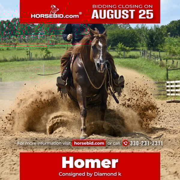⭐️ 𝐀𝐔𝐆𝐔𝐒𝐓 𝓐𝓵𝓵 𝓢𝓽𝓪𝓻 𝓛𝓲𝓷𝓮𝓾𝓹 ⭐️ Happening now thru MONDAY | AUGUST 25th - Available EXCLUSIVELY on HorseBid's website! For more details and to register visit: www.Horsebid.com CONSIGNOR CONTACT: Diamond k 330-231-2311 LOCATION: Jackson OH BREED: AQHA REGISTERED: Yes REGISTERED NAME: MR Electric Whiz COLOR: Chestnut HEIGHT: 15.1 AGE: 7 GENDER: Gelding Meet Homer as we call him around the barn a 2018 Registered AQHA gelding who stands 15.1 hands tall and is a very pretty Dabble Chestnut colored gelding! We have had the pleasure of taking him guy through our program and gotten to watch him proven himself in so many areas! Homer came from a very well respected reining program in Texas before we purchased him where he learned all the fancy Reining maneuvers and now has been with us at Diamond K for over a year now and gotten to be used in so many more ways the just his fancy reining maneuvers! Homer would make an excellent non pro rookie type Reiner for someone getting into the sport or he can go be a big time ranch rider or go be a safe willing trail partner or as we have seen over the past year he is a top tier ranch horse to work and rope cattle on and loves it! Starting with All of the arena maneuvers Homer has a very big and consistent sliding stop making him very very easy for any level of rider to rundown and say Whoa on stoping big every time. With his big stop he also is a very very easy horse to change leads on they are smooth and easy each and every time. Ideal for someone learning how to change leads! Homer has even been used at our farm a lot for new riders just learning to change leads or run and stop because of how easy it is for him and for riders to learn on. He also has a very solid consistent turn around he’s a point and shoot type horse for each of his reining maneuvers! Homer has a very consistent non pro show record already making him a very suited horse for someone wanting to get into the sport of reining! Now let’s talk ranch riding! We also feel like Homer could be the perfect horse for Someone getting into the growing ranch riding classes! He has a very pretty extended trot and smooth transitions and loves the ranch trail courses! From the pattern classes to the trail classes he checks each box very easily and would be well suited for the sport . For the ranch classes his easy turn around and lead changes and transition set him apart. Now let’s talk ranch work out doing a days work ! Homer this past year has spent tons and tons of time working cattle and riding feedlots! He is very cowy and will track and rate a cow perfectly. He’s on of the easiest horse to rope on and he’s roped tons of cattle out in the pasture to doctor. Once you rope the cattle Homer will work a rope and keep it tight while your off doctoring the cattle making him the ultimate ranch horse and a bonus is his confidences to go through rivers over logs up and down steep hills you name it he’s done it. We also think Homer would make a very very nice head horse for the team roping. His cow sense and natural rate on a cow would make it super easy to go to the team roping around on and excel at very quickly. Wether your in the market for a very user friendly all levels of rider kinda show horse or a ranch fun ranch horse Homer is your guy! Pedigree have we mentioned it to top it all off he is also very very well bred ! He’s an own son of MR electric spark who has won over $100k in NRHA earning! Homer is a very well built horse with good body and bone structure and has very good solid feet. He is 100% sound with no vices or health issues and is up to date on all UTD. We also as a bonus have current x rays available for you and your vet to view. You can contact us via call or text to have his x rays sent over to your vet! We can also help arrange shipping for you if your the lucky winning bidder and have boarding options available for you until he ships! Call or text our team to learn more or ask any questions you have about Homer at 330-231-2311.