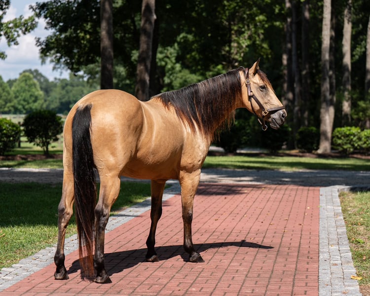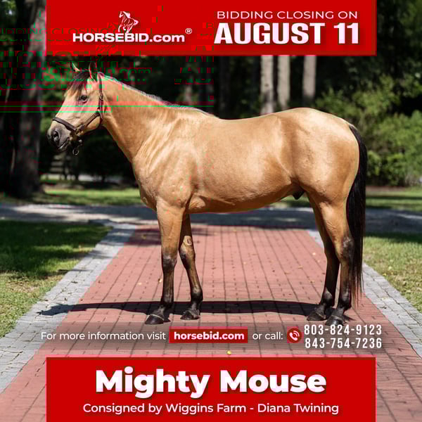 ⚜ The HERITAGE Classic ⚜ Happening now thru MONDAY | AUGUST 11th - Available EXCLUSIVELY on HorseBid's website! For more details and to register visit: www.Horsebid.com CONSIGNOR CONTACT: Wiggins Farm - Diana Twining Diana Twining 803-824-9123 or Amy Gesell 843-754-7236 LOCATION: Ehrhardt, SC BREED: American Quarter Horse REGISTERED: Yes REGISTERED NAME: AQHA Buenos Sunsation COLOR: Buckskin HEIGHT: 15.2 AGE: 7 GENDER: Gelding BUENOS SUNSATION (AQHA 5887841), known to us as MIGHTY MOUSE is a stunning young man that certainly turns a lot of heads when he walks off the horse trailer. He lives up to his registered name, because that shiny, golden coat is most definitely SUNSATION-al! Standing at 15.2, this well-built boy still takes up plenty of leg and could carry any size rider with ease. His last season of work was as a quail hunting mount, working around fluttering birds, running dogs, and gunfire as well as hacking out to the hunting grounds, roughly a mile away, down roads with traffic. Off-season, we discovered that he really enjoys playing with the Heel-O-Matic and showed excellent potential for ranch work.. We've had fun exploring this horse's vocation possibilities and what we've found is that he could go anywhere his rider wishes to take him!. Never minding the swing of the rope, the crack of a polo mallet, or the occasional hoot and holler from his rider, this versatile horse is game if you are! His good looks and lovely movements would make him a wonderful AQHA show prospect as well.. Gentle in hand, he loves baths, grooming, braiding, and stands well for both