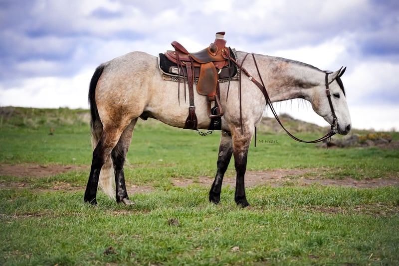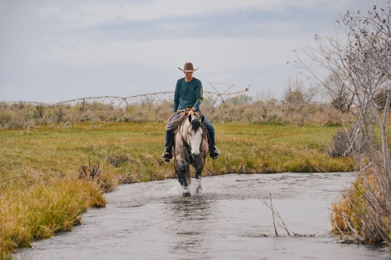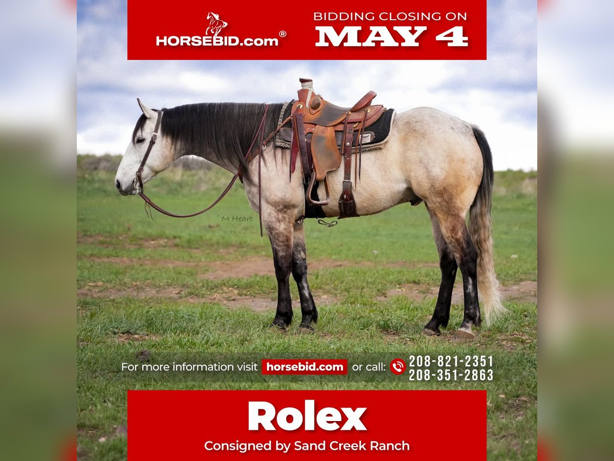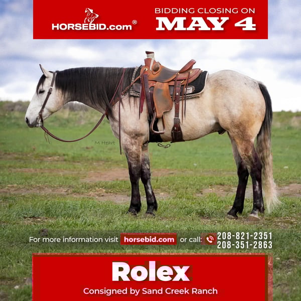 ▪️▫️◾️𝐭𝐡𝐞 𝑴𝒂𝒚 𝐒𝐞𝐥𝐞𝐜𝐭◾️▫️▪️ Happening now thru MONDAY | MAY 4th - Available EXCLUSIVELY on HorseBid's website! For more details and to register visit: www.Horsebid.com CONSIGNOR CONTACT: Sand Creek Ranch 208-821-2351 or 208-351-2863 LOCATION: Saint Anthony, ID BREED: Quarter Horse REGISTERED: No REGISTERED NAME: Rolex COLOR: Grey HEIGHT: 16 AGE: 7 GENDER: Gelding Rolex is a 7 year old Grade Grey Gelding. Not only does this guy have a beautiful long mane and tail but he is conformationally good looking and is super handsome to look at! He is an in your pocket gelding with a puppy dog personality. He is very friendly and enjoys being in peoples company. Rolex will come over to the shake of a grain bucket or will be the first meet you at the gate. Rolex will go where he’s pointed and can ride in a group or off on his own. Rolex lopes nice soft circles, has a good stop, neck reins, is light in your hands and throughout his body. He will side pass, is sacked out to a variety of things, will go over a teeter totter bridge, through pool noodles, tarps, big balls, ATVs, etc… Rolex has been started on the hot heels and hooked on to a few live steers. He’s also drug heavy logs and is no stranger to weight on the horn or seeing things on the end of a rope. Rolex has been rode both in the arena and outside. He steps out nicely, and has a nice ground covering walk. He has been rode up in the mountains on several trail rides, out on the desert and hauled to a few different arenas. He will cross logs and water with no problems. He is sure footed knows how to pick up his feet when navigating through various different terrain. Rolex stands around 16 hands. He will stand next to a mounting block for easy mounting and dismounting. Rolex will pick up all of his feet, stand tied, trailers and hauls with no problem. This gelding has all the potential in the world to finish how you want. His only draw back is occasionally at the lope he can get fresh. It’s not an every time we ride him type of thing it’s just been on occasion. He has never done it at a walk or trot just at a lope. Rolex would make a great pleasure or trail horse. He has a solid foundation, and easy going personality and super easy on the eyes. Theres a lot of good to this good looking boy! He’s got a lot of good years left to give someone. Take him and finish him out how you like. He is good to shoe, tie, haul and bathe.