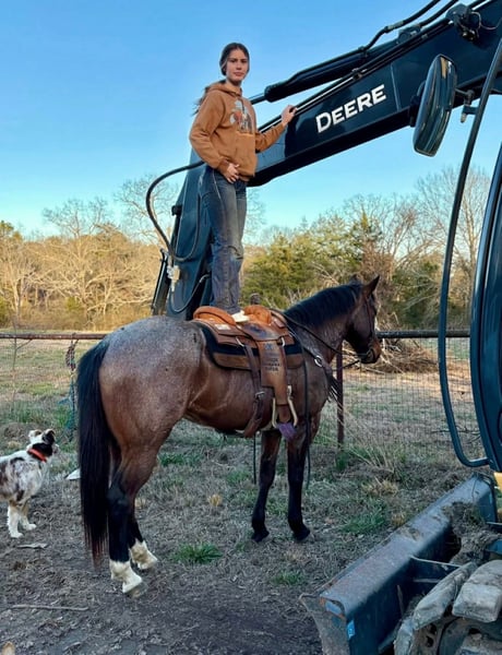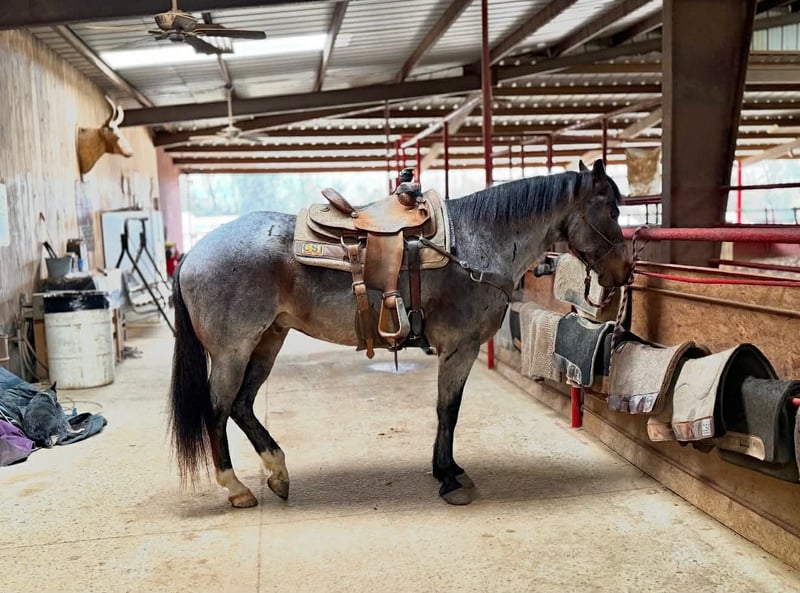 "AVAILABLE ON ONLINE HORSE AUCTION AT www DOT PlatinumEquineAuction DOT com BIDDING OPEN NOW thru SUNDAY | APRIL 12TH! *Final price will be determined on auction site* CONSIGNOR CONTACT INFO: Route 31 Equine 479-234-6514 LOCATION: Hatfield, AR Poco – 2019 AQHA Registered Roan Gelding Big 16H Ranch Horse Deluxe | Fancy Broke | Head Horse Prospect If you’re looking for a big, good-looking ranch gelding with size, substance, and an exceptional handle, Poco is one that deserves your attention. Standing approximately 16 hands and weighing approximately 1,400 pounds, Poco is a powerful, square-made gelding with excellent conformation and the kind of presence that turns heads wherever he goes. Poco is the definition of a ranch horse deluxe. He has been used for ranch work, gathering cattle, and is started on the head side, where he has been tracking and pushing cattle. With his size, strength, and natural ability, he shows great promise as someone’s number one head horse. At the same time, if you simply need a reliable ranch partner to check fences, doctor cattle, or cover big country, Poco is ready to go to work. Under saddle, Poco is very fancy broke and extremely enjoyable to ride. He carries a smooth rocking-chair lope and a steady, easy trot you can sit all day long. He lopes correct circles both directions and takes the correct leads with ease. He has an excellent stop, is soft in the bridle, and neck reins beautifully — lay the rein over his neck with one hand and off you go. He will side pass, counter-arc, and move off your leg, showing the kind of training and responsiveness that makes him a pleasure to ride. Outside the arena, Poco is confident and seasoned. He has been ridden everywhere from ranch work and cattle gatherings to barrel races, rodeos, and even down the highway and through town. He is not a spooky horse, handles new environments well, and will cross brush, rough terrain, and obstacles without hesitation. Poco travels exactly the speed you ask for — walk if you say walk, lope if you say lope. He is not a run-off and not a deadhead, making him enjoyable for long days in the saddle. On the ground, Poco is easy to handle and enjoyable to be around. He has a goofy, friendly gelding personality, is easy to catch wherever you find him, stands quietly tied, loads and unloads well, and is excellent for the farrier with good, hard black feet. He is also easy to bathe and stands quietly to be hosed off. Poco rides well alone or in a group, has a nice neck rein, and will open and close gates with ease. He is traffic safe, unfazed by dogs and wildlife, and stands patiently for mounting. He does well in a stall or turned out in the pasture, pastures well with other horses, and is an extremely easy keeper. Poco travels sound with no maintenance and sells 100% sound and ready to go to work. He comes with a current Coggins, and pre-purchase exams are welcome at the buyer’s expense. Poco is located in Hatfield, Arkansas. He is best suited for a confident rider that. He does best with consistent riding. Big, stout geldings with this kind of size, training, and versatility are becoming harder and harder to find. Whether you’re looking for a head horse prospect, dependable ranch partner, or a big comfortable trail horse, Poco is ready to go to work for you. For more information contact Jalene with Route 31 Equine at 479-234-6514.