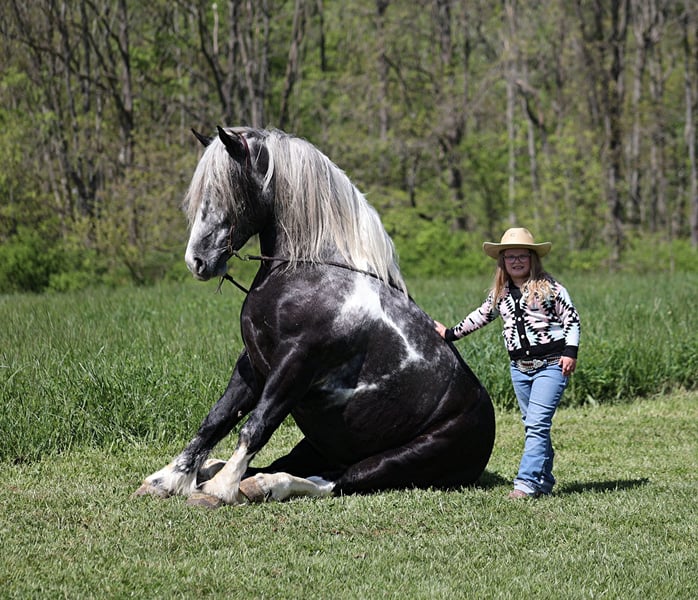 Consigned to Cowgirl Cadillacs in Sheridan, WY. Sales June 14-15th. You can bid online, phone bid or bid in person! With movie star good looks, muscles upon muscles and that long flowing hair you’d expect to see Slate on a Hollywood movie screen. Slate a stout built, 16H, 6 year old, grey tobiano draft-cross (paint/ quarter horse/ percheron) gelding that stands 16H tall. He is trained to lay down and sit, on command. Slate is everyone’s best friend and he loves attention. He has been used around the ranch and can pull anything that you can throw a loop on. If a mad momma cows pushs on him, he will just stay calm and push right back. The kids have ridden him around the ranch and checked cattle on him. He has seen the bright lights, heard the loud speakers and the roar of the crowd at the rodeo while shagging bulls from the arena. He has also been drove down the highways under harness and is traffic safe. Slate has a smooth jog, takes his leads and will lope as soft and slow as horses half his size! He has a good stop, sidepasses to open/shut gates and backs with ease. Slate has been exposed to all kinds of wildlife, he has been used in the mountains for hunting and has packed game. Slate is great on the trails, he picks his way through rocky terrain, crosses deep water, scales slopes with ease and walks across deadfall as well. If you need to feel safe and secure just hop on Slate and enjoy the ride, you will soon see that there is a lot more to this guy that what meets the eye! Call 606-308-2461 for more info.