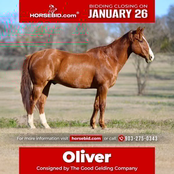𝐉𝐀𝐍𝐔𝐀𝐑𝐘 ⭐️𝑨𝒍𝒍 𝑺𝒕𝒂𝒓 𝑳𝒊𝒏𝒆𝒖𝒑⭐️ Happening now thru MONDAY | JANUARY 26th - Available EXCLUSIVELY on HorseBid's website! For more details and to register visit: www.Horsebid.com CONSIGNOR CONTACT: The Good Gelding Company 903-275-0343 LOCATION: Athens, TX BREED: Quarter horse REGISTERED: Yes REGISTERED NAME: GGC Oliver COLOR: Chestnut HEIGHT: 14.2 AGE: 8 GENDER: Gelding Oliver is a handsome 8-year-old chestnut gelding standing 14.2 hands. He’s a tried-and-true trail horse who confidently crosses whatever you point him at and builds confidence in his riders. He is happy to lead or follow and his steady nature makes him an excellent choice for group outings or solo adventures. He has a quiet, willing demeanor that suits a wide range of riders. On the ground, Oliver is as easy as they come. He has a soft, kind eye, is friendly and personable, and stands tied patiently all day without fuss. He requires no lunging and is ready to go when you are. Oliver has been handled and ridden by beginners and children, and his calm nature allows him to be ridden bareback with ease. He gets along well with other horses, fits seamlessly into a herd environment, and he is the type that makes ownership simple and enjoyable. Oliver is an ideal option for a family mount, confidence-builder, or anyone seeking a safe, uncomplicated gelding that delivers exactly what he promises.