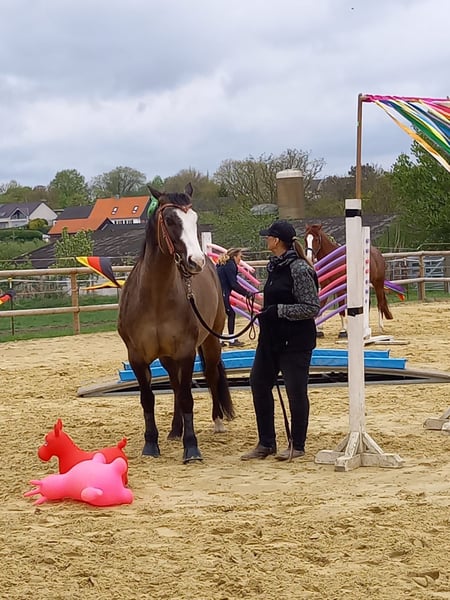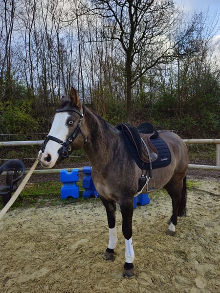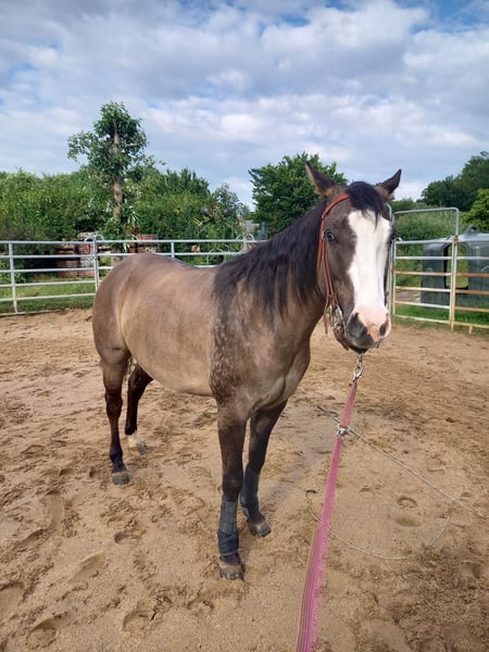 Iron ist ein bildschöner QH-Wallach in Sonderfarbe, ein echter Eyecatcher. Im Umgang ist er ein absoluter Schatz, brav und immer willig zu gefallen. Beim Schmied zeigt er sich sehr artig (vorne 2 Eisen) und auch alle tierärztlichen und osteopathischen Behandlungen/Untersuchungen bereiten keinerlei Probleme. Am Boden in allen bisherigen Situationen (landwirtschafliche Fahrzeuge, Hühner, Hunde etc.) sehr gut händelbar, immer stets in Vorsicht seinem Menschen gegenüber. Iron ist sowohl am Kappzaum, mit und ohne Gebiss, als auch am Halfter gearbeitet, kennt ausgebunden longiert zu werden. Er ist vertraut mit Platz, Halle, Gelände, Ovalbahn, dies an der Hand und auch geritten. Ebenso benimmt er sich gut im Roundpen und in der Führanlage. Der Schatz wird von mir regelmäßig trainiert, allerdings zeigt er ab und an eine Taktunreinheit im rechten Hinterbein, somit passe ich sein Training der jeweiligen Tagesform an. Dies ist auch der Grund, warum er weit unter Wert, als Beisteller, abgegeben wird. Ich möchte keine falschen Hoffnungen wecken. Eine Eignung als leistungsstarkes Sportpferd sehe ich nicht. Eher den Freizeitpartner in allen Kategorien des Pferdeumgangs. Wenn er nervös wird, klappert Iron mit dem Gebiss, dies hört auf, wenn sein Mensch ihm Sicherheit bietet. Probereiten ist im Schritt und Trab, gegen eine Gebühr von 35,00 € und ausschließlich mit meiner Begleitung, möglich. Es handelt sich nicht um einen Notverkauf und Iron ist auch kein "letzter Preis?...." Pferd. Es handelt sich um einen Privatverkauf aus Zeitmangel, alle geschilderten Infos sind mein persönlicher Eindruck hier vor Ort, Iron befindet sich seit drei Jahren in meinem Besitz. Veränderungen kann ich nicht vorhersehen. Alles Weitere gerne telefonisch. Auf Wunsch können auch Videos geschickt werden. Da ich viel bei den Pferden bin, kann ich eventuelle E-Mails nur abends beantworten.