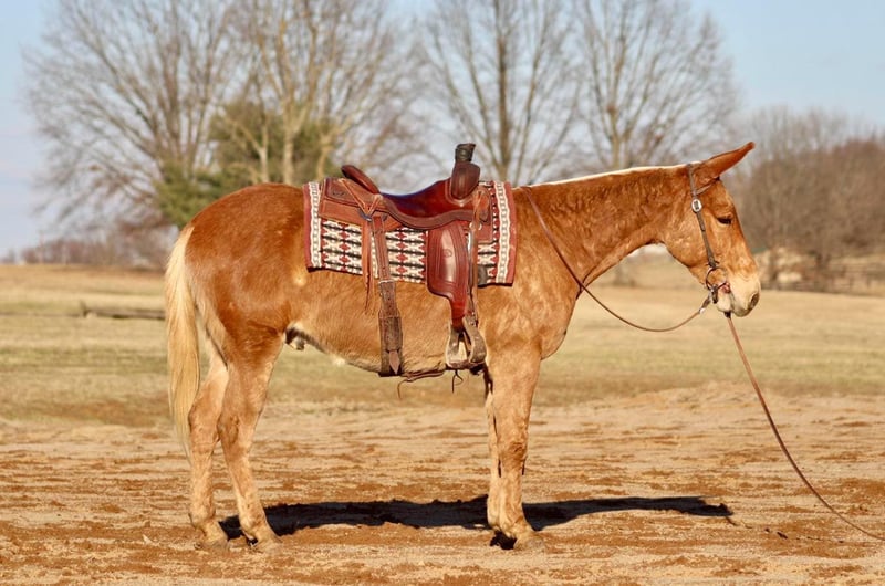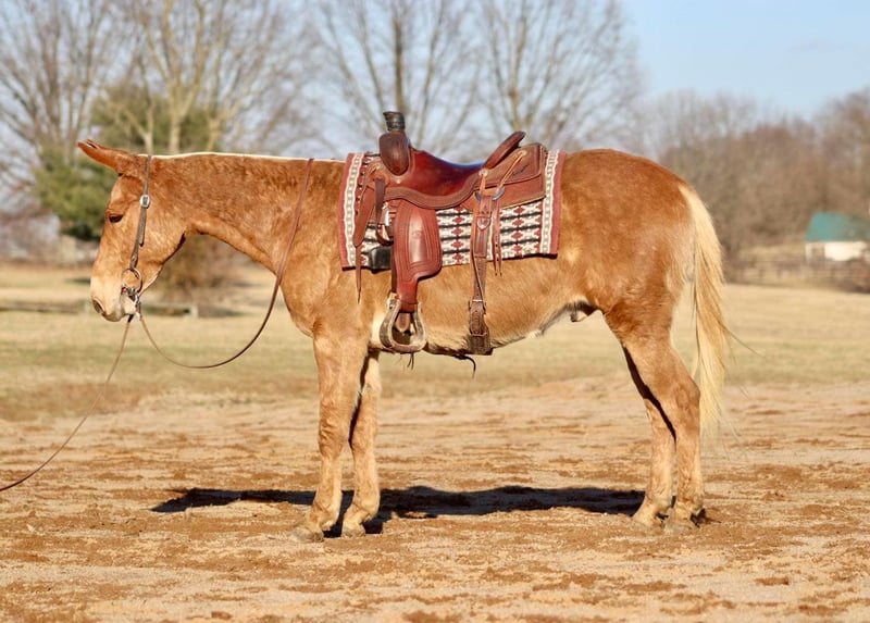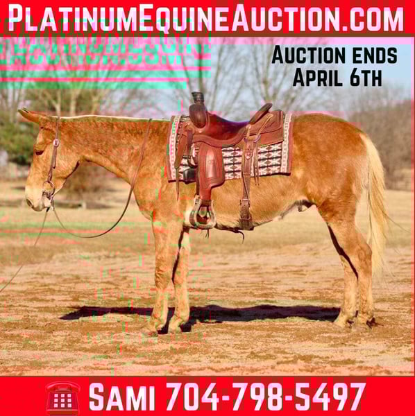 ONLINE AUCTION Place your bids at www.PlatinumEquineAuction.com Starting Bid $3500 Auction ends April 6th, 2025 Need a new saddle? Check out White Rock Saddles on our website or Facebook! Cisco is a 7 year old 14.3 hand palomino John mule. He is a well made and shapey mule and quite the looker! Cisco has lots of miles on the trails. From New England through the Midwest he has been around. Cisco takes in new places well and doesn’t get stressed traveling. He rides anywhere in the group. He will lead or follow. If you need to him to away from the group or wait behind, he will do it without a fuss. Cisco enjoys obstacles. He steps over logs, crosses water, goes up and down banks, steps through ditches. He has also done some arena obstacles too and really enjoys that! Cisco will walk, jog, and lope. He backs and has been learning to sidepass and starting to turn on the haunches and forehand. Cisco rides softly in the bridle and could easily be finished out and do some showing. He has a nice, easy jog or will trot out. He carries his head and neck well and riding outside goes on a loose rein. Cisco has ridden out with green mules and offers confidence to them and will lead them over obstacles and terrain they aren’t sure of yet. Cisco trailers well. He stands tied nicely whether it’s at the trailer or barn. He’s been hobbled. He’s been out on the overnight high line. He stands good to groom and tack up. Cisco is a super nice mule. He is friendly and enjoyable to be around. Just an overall good guy! For more information, please call/text Sammi Waugh 704-798-5497 Located in Brooksville, KY. ONLINE AUCTION Place your bids at www.PlatinumEquineAuction.com Starting Bid $3500 Auction ends April 6th, 2025 Need a new saddle? Check out White Rock Saddles on our website or Facebook!
