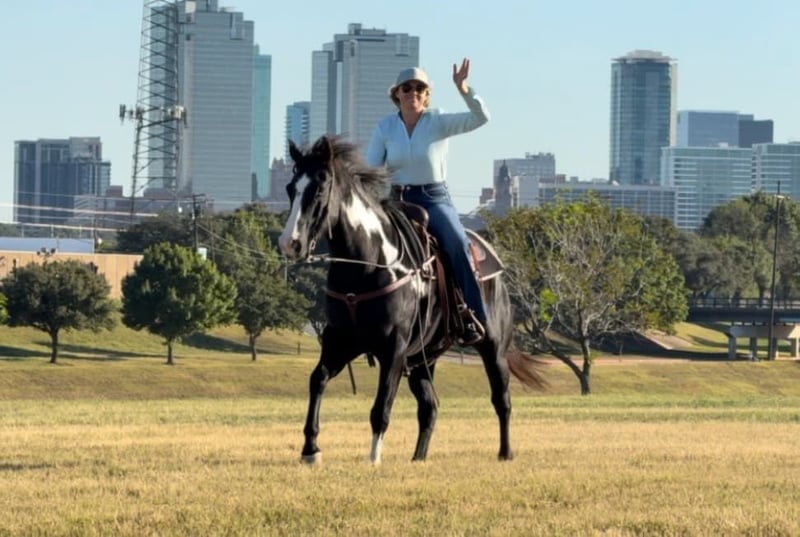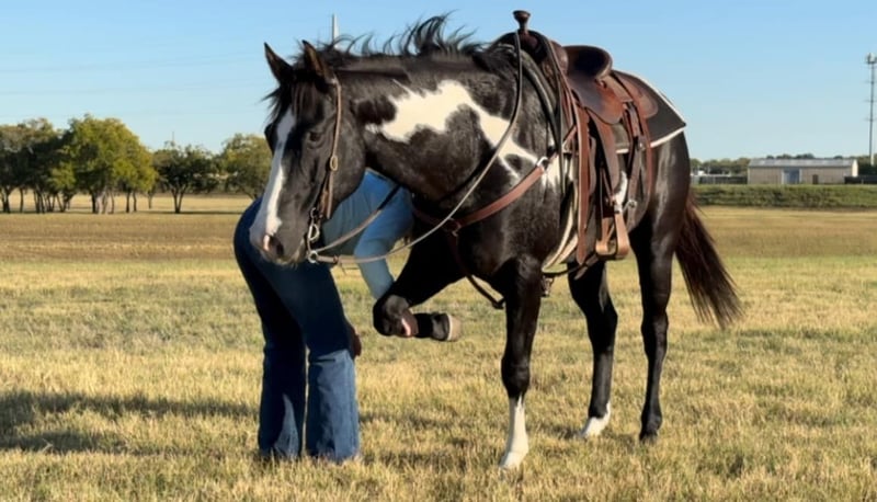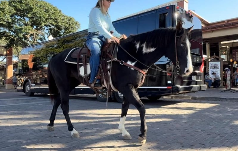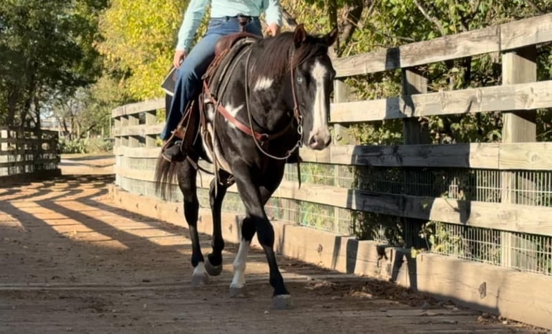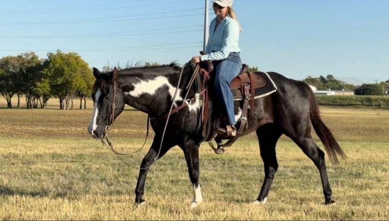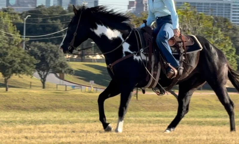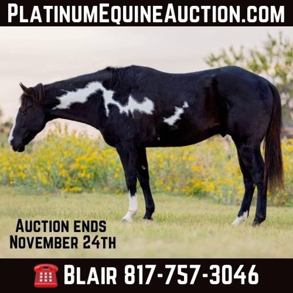 ONLINE AUCTION Place your bids at www.PlatinumEquineAuction.com Starting Bid $3500 Auction ends November 24th, 2024 Need a new saddle? Check out White Rock Saddles on our website or Facebook! Aero is the absolute SWEETEST 14.3H, 7 yr old gelding you’ll ever have the pleasure to know! He’s a GORGEOUS, deep black and white paint with one ice blue eye. He has one of the best, most personable personalities we’ve come across from any breed. Aero is a laid back and “go with the flow” type. He’s spent his most recent days as trail/playday/everyday bareback in a halter fun riding horse for a younger girl. Sports were a priority for her and that’s the only reason he’s available now. He rides absolutely SAFE and gentle. He’s moves off leg, rides one handled or two and is one we’d call more whoa than go. He’s not a dead head or lazy, but he wouldn’t mind just strolling. He is light in the face and stops right when you ask him to! ZERO buck, bolt or rear! He stands absolutely still for mounting and doesn’t move a foot until you ask him to. Aero has also been rode English and he’d be the perfect prospect for someone looking for a versatile mount. He’s calm, cool and collected with all things and has confidence, trusting personality. He bonds with people quickly and absolutely loves attention. The video posted is the first time he’s ever been down to the stockyards and he didn’t blink an eye at any of the loud cars, cranes or animals down there! He was also the center of attention everywhere we went and even stood absolutely still for a news article video!He’s a stunner and absolutely has the best personality to match his looks! Aero loads, leads, bathes and ties great and is current on teeth, feet and coggins! He is ready to go find his new person! Whether you want a safe gentle trail mount, lesson, playday or English prospect, you absolutely won’t be disappointed with this guy! More pics and videos on his website page at northtexashorsecompany.com/aero. Please call Blair with North Texas Horse Company for more info at 817-757-3046. We are located in Weatherford, TX and can help arrange affordable shipping to anyone!! ONLINE AUCTION Place your bids at www.PlatinumEquineAuction.com Starting Bid $3500 Auction ends November 24th, 2024 Need a new saddle? Check out White Rock Saddles on our website or Facebook!