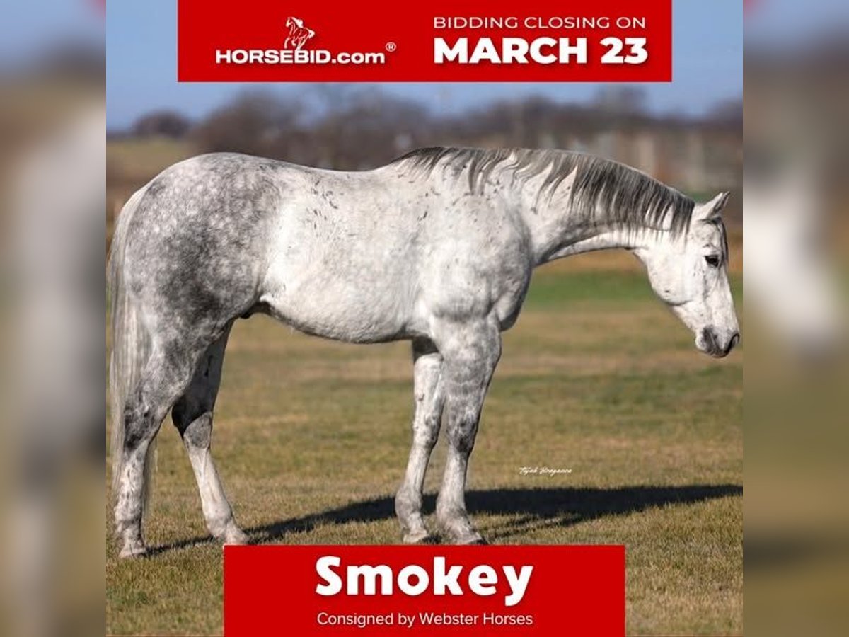 ⚜️𝓽𝓱𝓮 𝐆𝐎𝐋𝐃 𝓢𝓮𝓵𝓮𝓬𝓽⚜️ Happening now thru MONDAY | MARCH 23rd - Available EXCLUSIVELY on HorseBid's website! For more details and to register visit: www.Horsebid.com CONSIGNOR CONTACT: Webster Horses 817-559-3178 LOCATION: Ponder, TX BREED: QH REGISTERED: No COLOR: Gray HEIGHT: 15 AGE: 9 GENDER: Gelding Smokey is a 9yo 15hh beautiful gray gelding with dark points and webbing on his legs! Hes super flashy and is as solid of a horse as you will find. Smokey is 100% sound in every way. He is very fancy broke, spins both ways and has a nice soft turn around when you ask for it. He breaks at the poll and will never lift his head. Has a great headset and has had a lot of training that sticks with him. This horse is so easy to ride, he is so soft and broke just naturally. He carries himself so classy and you can feel that when you’re on his back. He has great feeling movement and is actually fun to ride regardless of what you’re doing on him. He’s comfortable and easy just being a basic trail/family horse or he’s broke enough to go in any direction in a ranch trail or obstacle course. He’s broke enough you could absolutely rope on him and he’s smart and willing enough he’d finish very easily. I can’t say enough good things about how civil this horse rides. He’s truly as broke as you could ask him to be. He will short lope off, and when you ask him to stop he has a beautiful stop! He has all the tools to do anything you want with him, but he’s gentle and good minded enough if you just want an exceptionally broke and easy going horse to love on he’d be great for that too! We really love his personality. He’s very sweet and loves attention. Stands all day for you to pet and brush on him. He’s good with his feet. Extremely easy to catch.. stands to be saddled and mounted.. etc. You name it Smokey will do it! He loads great in a slant load or open stock and backs off nice. Smokey has been hauled all around to different areas so he is not green in traveling. He isn’t buddy/barn sour when riding out either. He’s cool with being alone but is great with other horses too. Smokey is super easy all the way around. If you have any questions at all or want to set up a PPE at buyer's expense text Olivia at 817-559-3178. Shipping can be arranged anywhere.