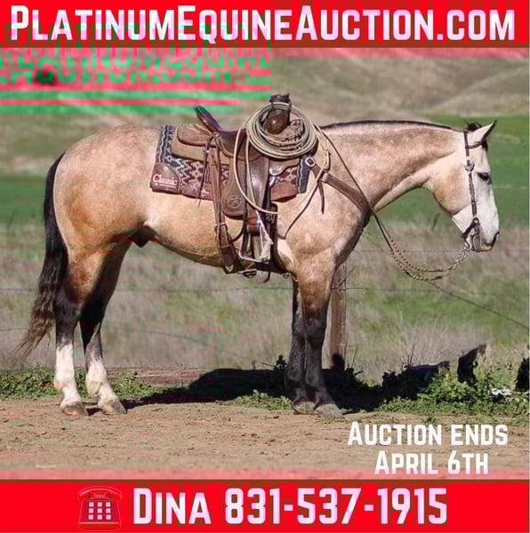 ONLINE AUCTION Place your bids at www.PlatinumEquineAuction.com Starting Bid $3500 Auction ends April 6th, 2025 Need a new saddle? Check out White Rock Saddles on our website or Facebook! If you’ve been searching high and low for your dream horse but haven’t found “the one” yet look no further because Ashton’s the one ! check out this beauty! He has it all: looks, a gentle demeanor, an incredible mind he’s truly the horse everyone needs in their barn. At 8 years old and a solid 15 hands tall, Ashton is the most conformationally correct horse you’ll ever lay your eyes on. His rare silver buckskin/rose grey coat shines like polished silver under the sun, perfectly complemented by his striking dark black mane, tail, and legs. Anyone can ride him; he makes any rider shine. Quiet and calm with no spook at all, Ashton rides slow and collected think of him as your very own equine partner for life. Whether it’s picking up leads flawlessly or executing fancy turns around in the arena with ease, he simply knows how to impress without any effort at all. Whether you’re out exploring tranquil trails or tackling rocky terrains while gathering cattle, he navigates with confidence and calmness that’s simply unmatched. Having worked cows in a variety of terrain he effortlessly navigates hills and trees while remaining unflappable around wildlife makes him stand out even more! On trail rides or just meandering along roadsides not a worry crosses his mind whether he’s riding alone or in a group. He’s also roped in branding pins and started out of the box beautifully! Nothing seems to ruffle his feathers; bridges, tires, flags none are obstacles for Ashton they’re merely playthings that add to his charm. This boy has been hauled and paraded through towns ridden by children; cars zooming past don’t faze him one bit! Ashton is the horse every rider dreams of. He handles time off well and is current vaccinations/coggins great for the farrier and vet. He enjoys a cozy stall on rainy day and loves being in the pasture as well. He is friendly enjoys being pampered loves his cookies patiently stands for grooming and tacking up. He is such a pleasure to be around. We have enjoyed every minute with this special horse. Please contact Longhorn Ranch Dina at 831-537-1915 located in Paicines, CA to meet this handsome boy! ONLINE AUCTION Place your bids at www.PlatinumEquineAuction.com Starting Bid $3500 Auction ends April 6th, 2025 Need a new saddle? Check out White Rock Saddles on our website or Facebook!
