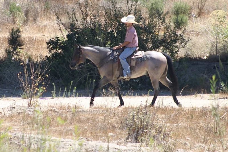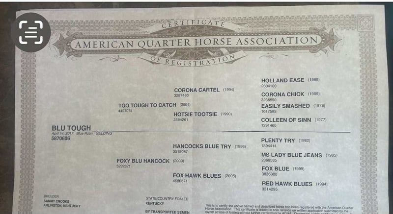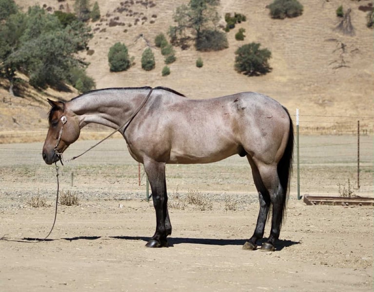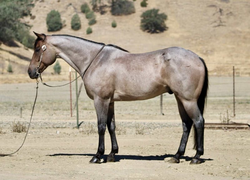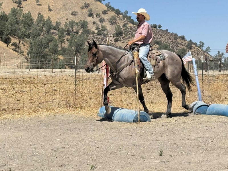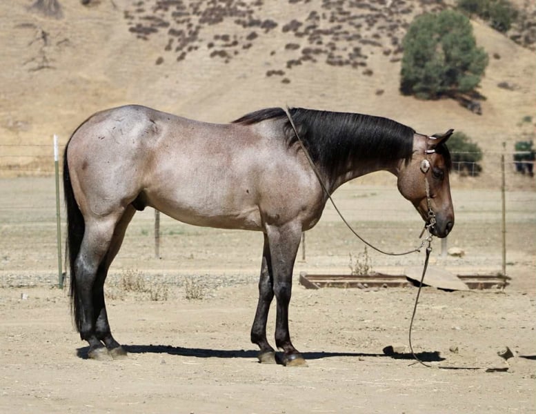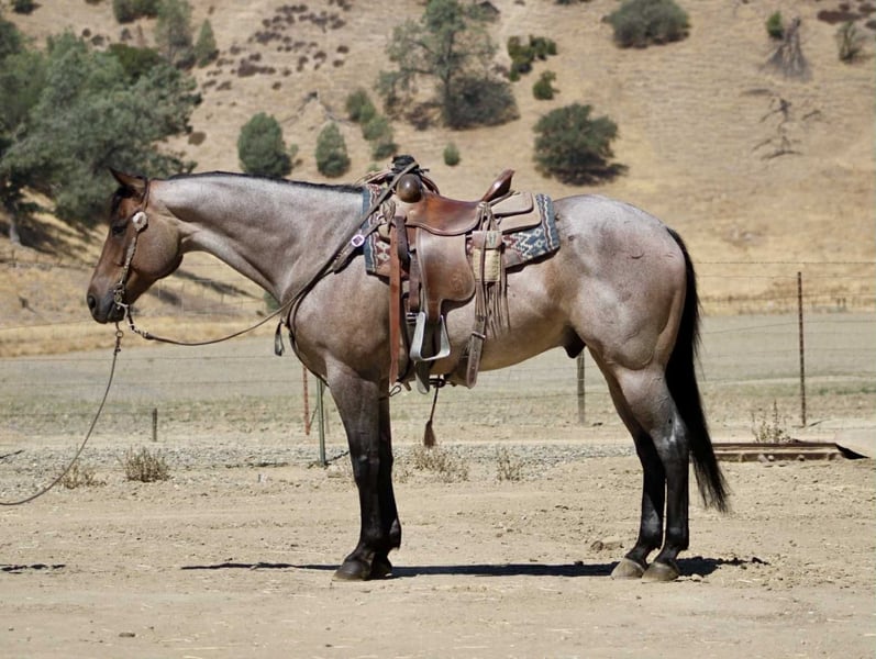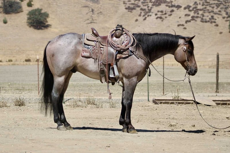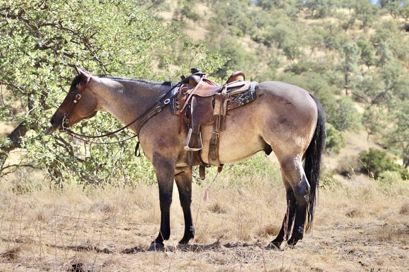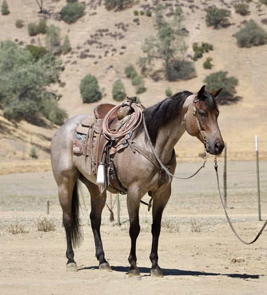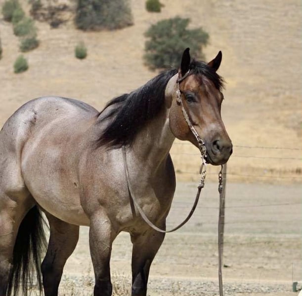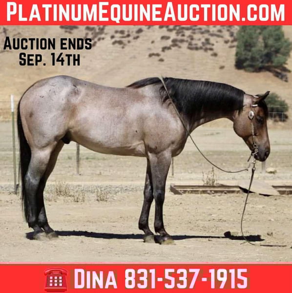 ONLINE AUCTION Place your bids at www.PlatinumEquineAuction.com Starting Bid $3500 Auction ends September 14th, 2025 Need a new saddle? Check out White Rock Saddles on our website or Facebook Blu Tough – The Breathtaking Blue Roan With a Mind to Match. They say a good horse will take you places, but a great one makes you enjoy the ride — and Blu Tough is that kind of gelding. This 2017 AQHA registered blue roan stands 15.1 hands and is built the way a horse ought to be: big-boned, with shape and steady, with that rich blue coat that’ll turn heads every time he steps out of the barn. Blu isn’t just a pretty face — he’s the kind that makes the job easier. He’s been used gathering cattle, started in the branding pen, and will pick his way through brush, rocks, creeks, or mud like he’s done it a thousand times. Point him at a hill and he’ll mosey up it with the same calm stride he always carries. Take him down the road, and he’ll stroll through traffic like he owns it. He doesn’t get bothered leaving the herd, whether in a group or heading out alone — Blu enjoys a solo stroll just as much as riding with company. He’s quiet, no-drama, and steady in every setting. Toss him an obstacle course, and he’ll handle it with the same quiet confidence — bridges, pool noodles, tarps, dragging, tires, you name it — Blu makes it all look like no big deal. And here’s the best part: he’s just plain enjoyable to ride. Blu has a slow, easy pace that makes every trip a pleasure, whether you’re polishing him up in the arena or just out for a relaxing ride. Soft in the bridle, smooth in his gaits, and always willing, he’s the kind of horse most anybody can get along with — steady enough for a casual rider, handy enough for someone who wants to go on and do more. His papers are just as sharp as his looks — Corona Cartel and Hancocks Blue give him the foundation, the athleticism, and the cow sense. What sets him apart is how that pedigree shows up in real life: strong, willing, and dependable, with the kind of versatility that makes him a fit for both work and play. On the ground, Blu is a gentleman. He’ll load himself in the trailer, stand tied, bathe, clip, shoe, and never fuss. He’s easy to catch, easy to haul, and a pleasure to have in the barn. He also gets along well with other horses, whether he’s in a stall or turned out in the pasture — simple to keep and always good company. There are plenty of pretty blue roans out there, but Blu Tough is the rare kind that’s as dependable as he is beautiful. The kind that makes work easier, trails more fun, and turns every ride into a memory you won’t forget. Blu is ready to become part of someone’s family — the kind you’ll be excited to saddle up day after day. Located in Paicines, CA. Call/Text Dina with Longhorn Ranch 831-537-1915. ONLINE AUCTION Place your bids at www.PlatinumEquineAuction.com Starting Bid $3500 Auction ends September 14th, 2025 Need a new saddle? Check out White Rock Saddles on our website or Facebook