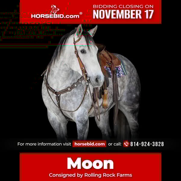 🎲𝓽𝓱𝓮 𝐑𝐈𝐃𝐄𝐑'𝐒 𝓒𝓱𝓸𝓲𝓬𝓮🎲 Happening now thru MONDAY | NOVEMBER 17th - Available EXCLUSIVELY on HorseBid's website! For more details and to register visit: www.Horsebid.com CONSIGNOR CONTACT: Rolling Rock Farms 814-924-3828 LOCATION: Miola Pa BREED: Quarter horse REGISTERED: Yes REGISTERED NAME: CEE HEART SALTY MOON COLOR: Grey HEIGHT: 15.2 AGE: 8 GENDER: Gelding CEE HEART SALTY MOON, known as Moon, is a registered eight year old gelding standing 15.2 hands with a gorgeous dapple grey coat complemented by a long, thick, beautifully maintained mane and tail. His conformation, expression, and movement show both refinement and athleticism, making him a standout offering for riders seeking quality, training, and presence. His looks turn heads everywhere he goes, and his manners and rideability match his impressive appearance. Moon is extremely broke, very well finished, and schooled to a high standard in both English and Western disciplines. He rides with a soft and responsive feel, willingly maintains a correct headset, and guides easily with a one hand neck rein. His transitions are quiet, smooth, and balanced, and he steps into a collected lope on either lead without hesitation. He frames himself beautifully at the walk, trot, lope and has a big stop. showing adjustability, and excellent responsiveness to leg and seat aids. His arena work is polished and dependable. Moon performs consistent lateral movements, including an accurate side pass that makes opening and closing gates simple. He executes clean and correct pivots and stays soft, and focused throughout the ride. His body control and balance make him an ideal choice for a rider who appreciates refinement, while his steady temperament and forgiving nature make him suitable for someone who is still learning. He is the type of horse that helps a rider look and feel like a professional level partner. Moon is equally impressive outside the arena. He is confident, willing, and sure footed on the trail, easily navigating wooded terrain, water crossings, thick brush, steep areas, open fields, and uneven ground. He has been exposed to dogs, livestock, farm equipment, and typical activity around a working property. He rides out alone without hesitation and travels quietly in a group, maintaining a relaxed and composed demeanor in both familiar and new environments. His ground manners are as impressive as his under saddle work. Moon stands patiently for grooming, tacking, bathing, and veterinary care. He loads and hauls well, adjusts comfortably to new places, and transitions smoothly between stall living and pasture turnout and is in the middle of the pecking order. He is polite, respectful, and easy to handle, reflecting consistent and quality management throughout his life. Moon is well suited for an intermediate rider or an amateur seeking a horse with professional level training who is both capable and forgiving. He has the training, and temperament to impress experienced riders while remaining kind, patient, and enjoyable for someone who wants to continue growing. Moon is offered for sale with a current negative Coggins test, a current rabies vaccination, recent deworming, and a complete health and lameness examination performed on 11/3/2025. He is fully prepared for his next home and program. If you would like to check out Moon or have any questions please feel free to contact Ethan at (814) 924-3828
