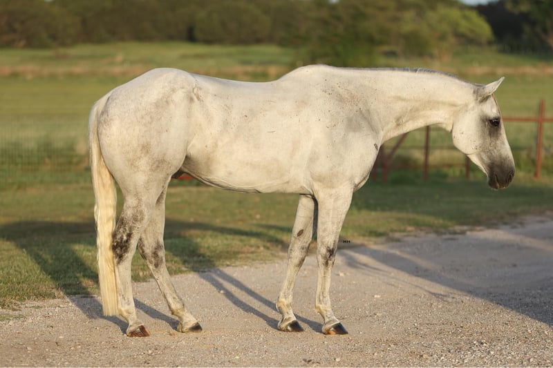 ONLINE AUCTION Place your bids at www.PlatinumEquineAuction.com Starting Bid $3500 Auction ends July 28th, 2024 Need a new saddle? Check out White Rock Saddles on our website or Facebook! Greys Dashing Twist aka “Zeus” is a 7 year old Appendix Registered Quarter Horse gelding that stands at 16.2H. This big guy has your typical go with the flow gelding personality. He is very willing to please and tries his hardest to do whatever you ask. Zeus is quite athletic for his size and is capable of various disciplines because of his athleticism. His physical abilities aren’t his only attributes as he is extremely smart and figures out how to navigate hard or stressful situations quite easily. Zeus prefers to be ridden English but will go nicely Western as well. I believe he will excel in most English disciplines. He is very calm and willing under saddle and will happily walk, trot, canter both ways on a fairly loose rein. He is trained to listen to leg and seat pressure as well as direct or neck reins. Zeus can be ridden with or without other horses with no problems. Zeus has excellent ground manners, he stands to be groomed, saddled, and bathed. He loads on and off the trailer like a dream. He is happy to live outside with other horses and is typically lower in hierarchy in the herd, he does well in a stall also. He is a wonderful horse to be around and has a lot of potential as an English horse, but will also make an excellent trail horse as well. Zeus is currently barefoot but arrangements can be made to shoe him before he leaves my facility if you’d prefer. He has also recently been seen by our vet, dentist, and chiropractor so he is all set to go to his new home! For more information or questions about Zeus please contact Sydney with SRS Training and Sales 518-935-8282. Zeus is located in Granbury, TX but the SRS team is happy to assist in shipping across the US. ONLINE AUCTION Place your bids at www.PlatinumEquineAuction.com Starting Bid $3500 Auction ends July 28th, 2024 Need a new saddle? Check out White Rock Saddles on our website or Facebook!