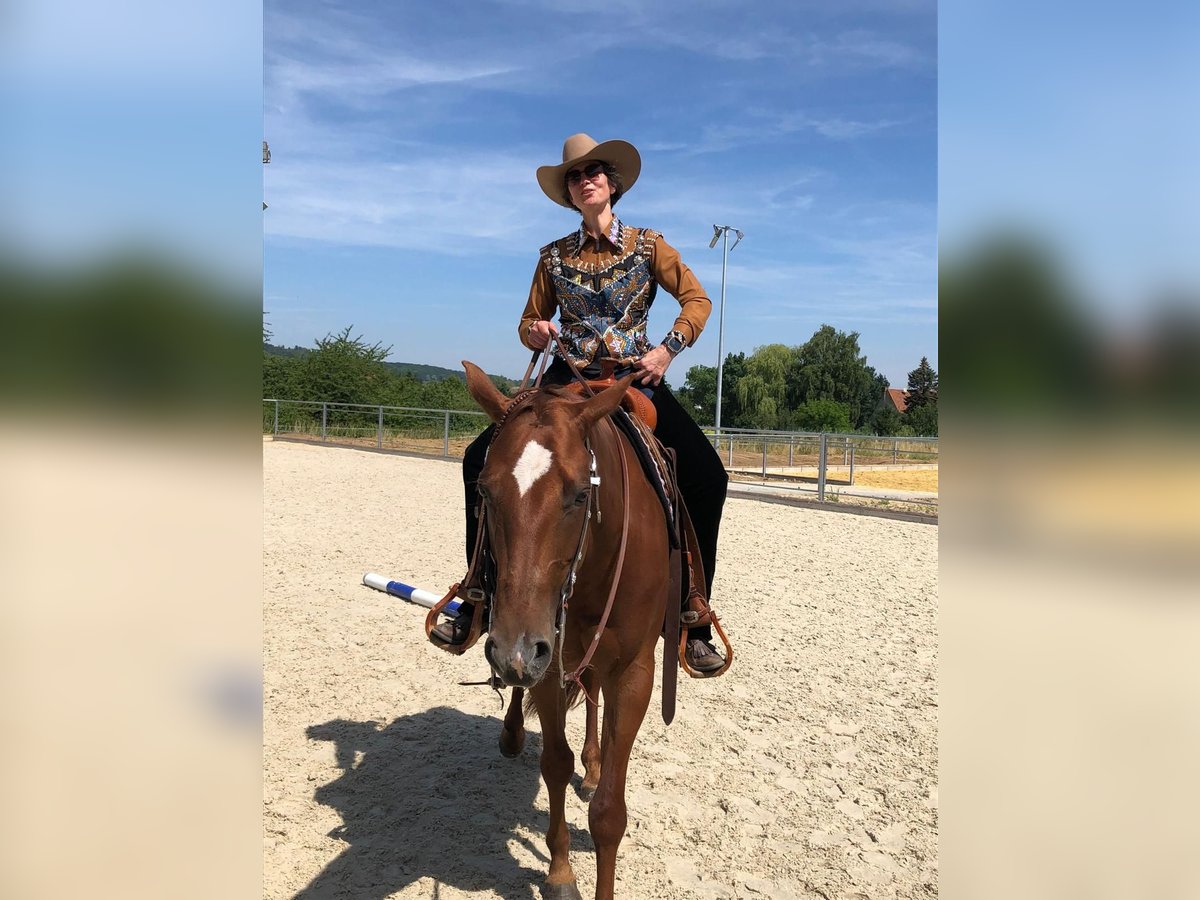 TFR A Blaze Of Glory ist eine bildhübsche, großrahmige und korrekt gebaute Quarter Horse Stute. Sie wurde im Januar 2016 geboren, ist chestnutfarben und hat ein Stockmaß von ca. 163 cm. \"Eve\" ist eine Stute mit einem ganz lieben Charakter. Sie ist sehr menschenbezogen, freundlich und neugierig und zeigt sich im täglichen Umgang stets unkompliziert und gelassen. Im Handling ist sie sehr brav und angenehm. Eve ist schmiede- und verladefromm, geimpft und regelmäßig entwurmt. Eve kennt sowohl Boxenhaltung mit Paddock und Weidegang als auch Offenstallhaltung und ist sehr sozial sowie herdenverträglich. Unter dem Sattel zeigt sie sich ruhig, brav und angenehm zu reiten. Sie verfügt über weiche, gute Gangarten und ist sehr bequem zu sitzen. Auch Reitfehler verzeiht sie, weshalb sie sich ebenfalls gut für Anfänger eignet. Gleichzeitig bringt sie viel Lernwillen und Talent mit und kann auch einem ambitionierten Reiter viel Freude bereiten. Sie ist fein an den Hilfen und gut ausgebildet. Eve besitzt eine sehr gute Westernausbildung und wurde kontinuierlich von Trainern gearbeitet sowie auf verschiedenen Kursen weiter gefördert. Sie wurde bereits erfolgreich in Ranch Riding, Ranch Rail, Trail, Pleasure und Horsemanship geshowt. Mit dem fliegenden Galoppwechsel wurde begonnen, dieser ist jedoch noch nicht vollständig sicher. Auch im Gelände zeigt sie sich stets ruhig und unkompliziert, selbst wenn sie alleine unterwegs ist. Bei ihr wurde 2020 als Zufallsbefund bei einer AKU Spat festgestellt, womit sie bisher jedoch keinerlei Einschränkungen oder Lahmheiten gezeigt hat. Röntgenbilder können selbstverständlich eingesehen werden. Im Jahr 2025 wurde zusätzlich auf beiden Vorderhufen ein Hufrollenbefund festgestellt. Daraufhin erhielt sie eine Stammzellentherapie, die sehr gut angeschlagen hat, sodass sie seitdem lahmfrei ist. Vorne läuft sie mit Spezialbeschlag, hinten barhuf. Diverse Röntgenbilder sowie eine AKU können eingesehen werden. Eve ist ein tolles Pferd für einen Reiter, der sich von ihrer Diagnose nicht abschrecken lässt und weiterhin mit ihr arbeiten möchte. Ob als Turnier- oder zuverlässiger Freizeitpartner - sie ist ein liebes Pferd.