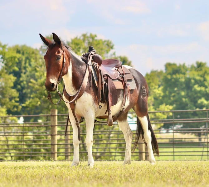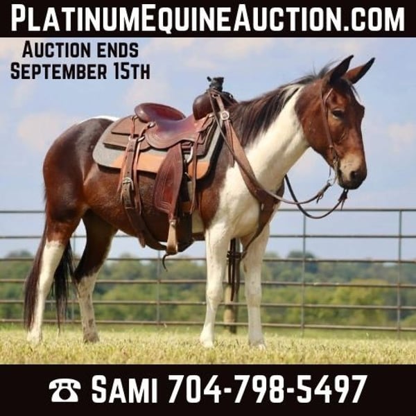 ONLINE AUCTION Place your bids at www.PlatinumEquineAuction.com Starting Bid $3500 Auction ends September 15th, 2024 Need a new saddle? Check out White Rock Saddles on our website or Facebook! Vegas is an 8 year old, 14.1 hand hand Molly mule. Her unique bay and white color is sure to be the talk of the town, and there won’t be another one like her out and about! We have had all levels of riders on Vegas. She rides the best on a full drape with a nice, level head. She prefers to walk and jog, but does lope happily across the pastures and fields. Vegas does all natural obstacles on the trails. She loves the water, and goes nicely down steep banks and hills. She walks over logs. She rides out alone or with the group. Vegas rides quietly with an experienced rider and takes care of them on the trails. We have taken her downtown to ride and she does well with the hustle and bustle of the city. She is a great ranch mule. She’s comfortable around cattle riding through the herd checking them daily. She will sort pairs, load trucks, and rope/doctor cattle. When it comes to work and riding, there isn’t much she can’t do. Vegas is good to take on camping tie out to the high line. Her good looks and thick hair are not what you see on mules often, but Vegas has it! For more information, please call Sammi Waugh 704-798-5497 Located in Brooksville, KY. ONLINE AUCTION Place your bids at www.PlatinumEquineAuction.com Starting Bid $3500 Auction ends September 15th, 2024 Need a new saddle? Check out White Rock Saddles on our website or Facebook!