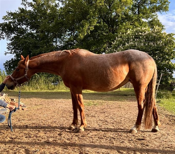 Zum Verkauf steht meine bildschöne Red Roan Stute mit einem Stockmaß von 1,49m. Sie war in den letzten Jahren ausschließlich in der Zucht im Einsatz und hat dabei mehrfach mit unkomplizierter Trächtigkeit überzeugt – sowohl mit TG als auch mit Frischsamen. Sie ist aktuell leer und kann daher mit einem selbst gewählten Hengst belegt werden. Abstammung siehe Bilder. Ihre Fohlen zeichnen sich durch einen herausragenden Charakter, sehr gutes Exterieur sowie tolle Bewegungen aus (letzte Bilder). Die Stute ist grundsätzlich geritten, wurde aber in den letzten Jahren nicht weiter gefördert und müsste daher wieder an die Arbeit unter dem Sattel herangeführt werden. Ich bin sie immer nur sporadisch geritten, dabei war sie aber immer steht’s brav. Sie ist absolut lieb im Umgang, zeigt keine Unarten und ist sowohl schmiede- als auch verladefromm.