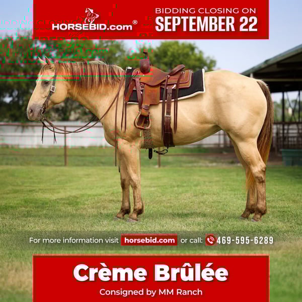 🍁𝒕𝒉𝒆 𝐅𝐀𝐋𝐋 𝑺𝒑𝒆𝒄𝒕𝒂𝒄𝒖𝒍𝒂𝒓🍁 Happening now thru MONDAY | SEPTEMBER 22nd - Available EXCLUSIVELY on HorseBid's website! For more details and to register visit: www.Horsebid.com CONSIGNOR CONTACT: MM Ranch 469-595-6289 LOCATION: Forney, TX BREED: Quarter Horse REGISTERED: No COLOR: Champagne HEIGHT: 16 AGE: 11 GENDER: Mare 🍮🤤 Crème Brûlée 🍮🤤 is a UNICORN!! Yes a real life unicorn!! Just 11 yrs old and standing a whooping 16 hands tall. This big girl tips the scales at 1450 lbs. She is not one you can hide. She stands out like a glowing bright light. She is the most unique champagne palomino colored. She is a big thick made girl. (Pics do not do her justice.) She is hands-down a favorite at the barn!!! From our sweet barn helper, to the little girl in the videos, to the neighbors all around us. She is unanimously everybody's favorite! She absolutely craves attention. If you are outside she wants to know what you are doing. She is overly kind natured and sweet. ❤️ And the best part is she is safe for anyone to ride. I’m talking like beginners and first time horse owners safe to ride. She is athletic and very versatile for an advanced rider to also enjoy as well. She is an extremely pretty mover. She has the smooth trot and lope. She is comfortable and easy to ride. Crème has been rode outside a lot on trails and on the ranch. She is solid and just the right age to go do any job that you have for her. She is super easy to do everything with, she is so easy to catch, saddle, bridle, step-on, shoe, load, haul, and stands tied anywhere. She is happy out alone or with other horses, and she loves being up in the show barn and being pampered! She trail rides out very confidently alone but/and is also well-mannered in a group. She is easy to get along with turned out with others, easy to get along with in any group. She is fit, in great shape, and ready to go. She's so sweet and gentle and quiet natured (I can’t say that enough). This mare will not walk over you, she’s not pushy, absolutely no bad habits, no buck, no bad ground manners, requires nothing special to own and operate her. 🍮🍮 Crème Brûlée is truly a unicorn. You will be hard pressed to find another one like her. She is 100% sound in every way. We can and will help arrange shipping.