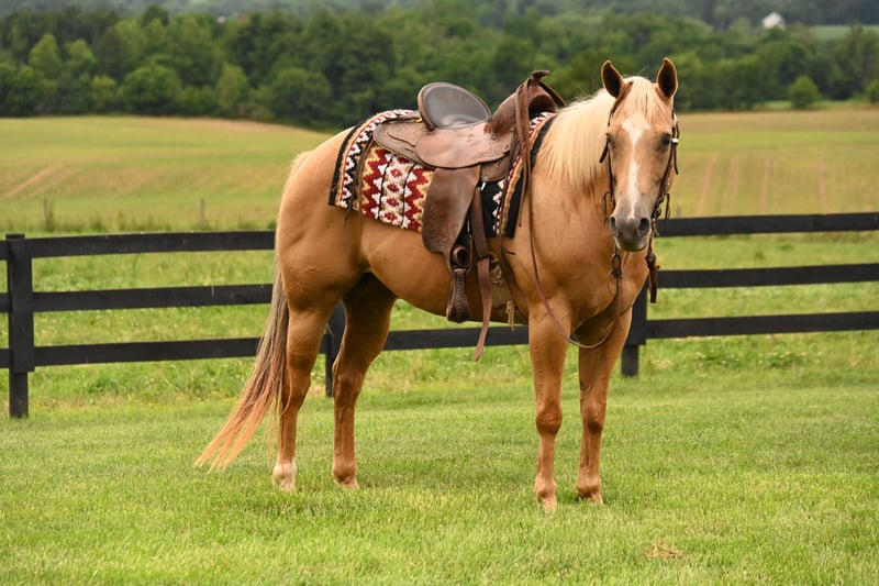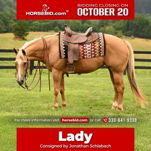 ♦️ 𝐭𝐡𝐞 𝐀𝐌𝐄𝐑𝐈𝐂𝐀𝐍 𝓕𝓪𝓵𝓵 𝓒𝓵𝓪𝓼𝓼𝓲𝓬 ♦️ Happening now thru MONDAY | OCTOBER 20th - Available EXCLUSIVELY on HorseBid's website! For more details and to register visit: www.Horsebid.com CONSIGNOR CONTACT: Jonathan Schlabach 330-641-9330 LOCATION: Fredericksburg, OH BREED: Quarter Horse REGISTERED: Yes REGISTERED NAME: One Treasured Lady COLOR: Palomino HEIGHT: 14.3 AGE: 13 GENDER: Mare Lady is a 13-year-old, double registered AQHA and Palomino Horse Association mare standing 14.3 hands tall, and she is as broke and dependable as they come. She has been with our family the past three years, and our girls have enjoyed her immensely both in the arena and on the trails. Lady is the kind you can trust—quiet, safe, and steady—yet still willing and responsive. She’ll lope around the arena nice and smooth, knows her way around the barrels, and she’s an absolute gem on the trails, whether you’re riding alone or with a group. She has been on overnight rides, handles dogs, traffic, loading, and all the everyday things without a fuss, and she is truly a joy to have around. While she might be a bit much for the tiniest beginner, she’s an ideal fit for a confident youth or adult rider. On top of her sweet, willing disposition, Lady is drop-dead gorgeous, the kind of mare that turns heads everywhere she goes, and she would make someone an incredible partner.