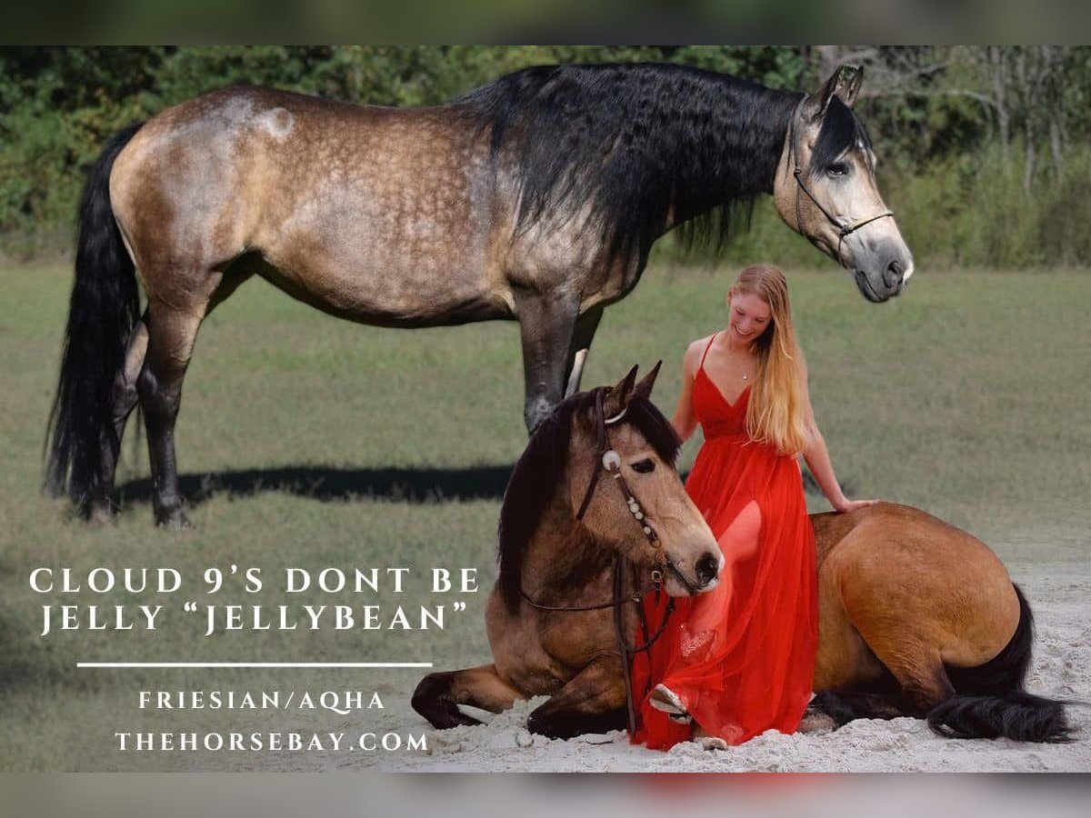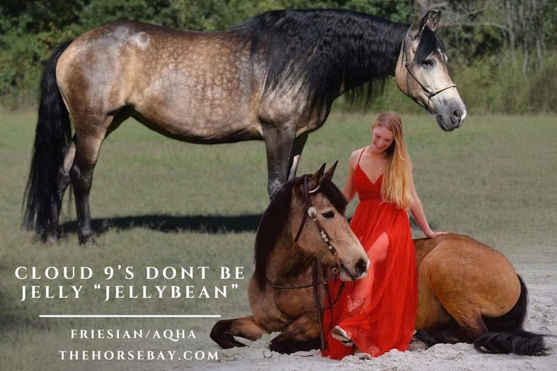 Meet Cloud 9’s Don’t Be Jelly “Jellybean” 2013 | 15.1h | Double Registered AWSSR/FSA 50% AQHA × 50% Friesian Mare Barefoot, UTD on everything. Jellybean is the kind of mare you don’t come across often; sooty buckskin wrapped in dapples. She’s been shown through First Level Classical and Western Dressage schooling, second level movements, and Jump schooled 2ft. She’s not just about the arena; Jellybean has been ridden down beaches, conquered trail obstacle challenges, and takes traffic, cattle, tractors, flags, and even gunfire in stride. Trick-trained too, she’ll bow, smile, lie down, and show off at liberty. Honest and forward-thinking, she’s safe enough to be used in lessons, yet responsive enough to be a confident rider who enjoys a horse with feel. She’ll side-pass to meet you at the mounting block, open gates with ease, and stand quietly wherever you put her. She’s a dream to have in the barn as well — clean, seriously, goes all in the back corner. ? Quiet and completely vice-free. Microchipped, 6-panel N/N, lifetime USDF number, and clean X-rays on file. No maintenance, no issues, just a truly versatile, well-cared-for mare. Jelly loves a confident kid and is game for anything, though she’s likely a bit too forward for Grandma unless she likes the wind in her hair. She’s got a big Friesian canter, she’s very respectful, and has a big stride. We raised and trained her ourselves, and she’s only available as our focus has shifted to Appaloosa Ranch horse events. She’s incredibly special and will make someone’s dream horse. Please reach out with any questions or to meet Jellybean.