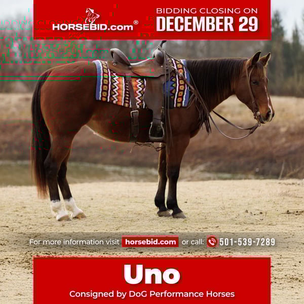 ⚜️ 𝓗𝓮𝓻𝓲𝓽𝓪𝓰𝓮 𝐖𝐢𝐧𝐭𝐞𝐫 𝓒𝓵𝓪𝓼𝓼𝓲𝓬⚜️ Happening now thru MONDAY | DECEMBER 29th - Available EXCLUSIVELY on HorseBid's website! For more details and to register visit: www.Horsebid.com CONSIGNOR CONTACT: DoG Performance Horses 501-539-7289 LOCATION: Vilonia, AR BREED: Quarter Horse REGISTERED: Yes REGISTERED NAME: Uno Del Cielo COLOR: Bay HEIGHT: 14.1 AGE: 13 GENDER: Mare Unos del Cielo is a 2011 mare by UNO WHAT TIME IS IT, standing 14.1hh and built short, stout, and athletic. She is an extremely quick, catty mare with an exceptional amount of try and heart, always willing to go to work and give her rider her all. She is well broke with all the buttons—correct leads, rollbacks, spins, and the ability to work the fence—and is responsive and handy in everything she does. Outside the arena, she makes a nice short cowpony that’s easy to take out of the stall or pasture and go get a job done. This mare would suit a solid-handed rider or a motivated youth ready to move up and gain confidence, offering versatility, willingness, and the kind of grit that makes a dependable all-around partner both in and out of the pen.