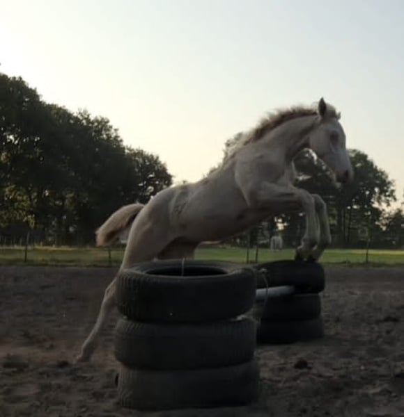 Mooie smokey cream dun jaarling D-pony merrie. Wegens annulering van in opdracht aangekochte merrie, nu beschikbaar. Ella is een mooie stevige Quarter Pony, ingeschreven bij het Zuchtverband für Schecken und Spezialrassen, in Duitsland. Haar kleur is smokey cream dun, homozygoot voor zwart en cream (zie kleuruitslag) Verwachtte eindmaat rond 147cm. Ella wordt in februari ge-ent, met alle andere paarden mee. Bij eerdere verkoop wordt ze ge-ent voordat ze naar nieuwe huis vertrekt. Ella is bij stamboekopname gekeurd met een 8, is up-to-date met hoefsmid en ontwormen. Heeft een pedigree en paardenpaspoort, alsook volledige kleurtestuitslag. Kent transport, hoefsmid, dierenarts, meelopen. Slaat niet, bijt niet. Wel beetje schuchter in begin. Maar geen angst of nerveus gedrag, niet in groep en niet in omgang. Leeft hier 24/7 buiten in groepje leeftijdsgenoten. Is hier laagste in rang. Transport naar nieuwe eigenaar, binnen 200km, bij koopprijs inbegrepen. Verdere afstanden voor een hele redelijke bijdrage in onkosten. Serieuze, nette reacties krijgen een serieus, net antwoord. AUB bij voorkeur per Whatsapp +31610271771 EN-DE-NL Anonieme, random vragen alhier worden niet beantwoordt. Uw voornaam en telefoonnummer wordt gewaardeerd.