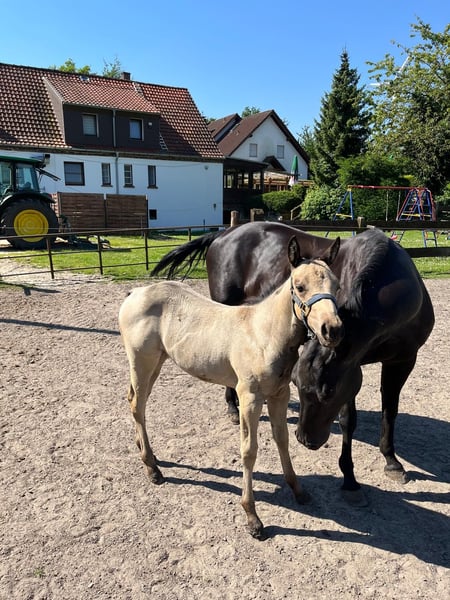 Bärbel – 1-year-old Quarter Horse mare in Dark Buckskin with top pedigree. A real eye-catcher with charm, presence, and quality! Our Bärbel is a stunning, dark buckskin filly with that special something. Already, she shows what she has to offer – a dream horse with expression, harmonious conformation, and a clear, friendly character. ✅ Age: 1 year ✅ Color: Dark Buckskin ✅ Breed: Quarter Horse ✅ Pedigree: Sire: SR Hollywood Dundee (Hollywood Dun It line) Dam: SR Reminics Melinda (sired by Reminic) With her excellent pedigree, Bärbel combines proven reining genetics – Hollywood Dun It meets Reminic – and brings everything you could wish for in terms of sport, show, or breeding. She is raised in a species-appropriate manner, is halter trained, curious, and people-oriented. Whether you are looking for a future sport partner, a breeding jewel, or simply a horse with presence – Bärbel attracts all eyes! If you are interested and would like more information, we look forward to hearing from you.