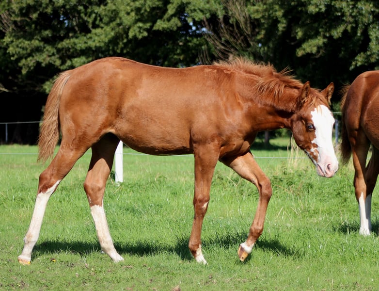 Custom Chrome Line | Modern | Athletic | Performance-Ready We are offering an expressive American Quarter Horse mare, born in 2025, featuring a striking, eye-catching blaze and a large-frame, modern build characteristic of the Custom Chrome lineage. This mare combines size, substance, and athletic elegance – exactly the type in demand in today’s reining sport. She already demonstrates natural talent for reining: good balance, body control, and a pleasant self-carriage. Notably, she shows a high willingness to learn and a calm, people-oriented nature – ideal prerequisites for future training in the sport. Breeding & Papers The mare has been raised in a professional, horse-friendly environment and is well-handled for her age. She possesses: - AQHA Certificate of Registration (COR) - DQHA Equine Passport She has been regularly dewormed and is familiar with the farrier, laying a solid foundation for her further development. Prospect A high-quality reining prospect for ambitious non-pro or open riders, as well as for breeders seeking a large-frame, modern type with performance potential and charisma. ✨ Further upbringing at our facility is possible 📍 Location: Stade, Germany 🌐 www.white-diamond-horses.de