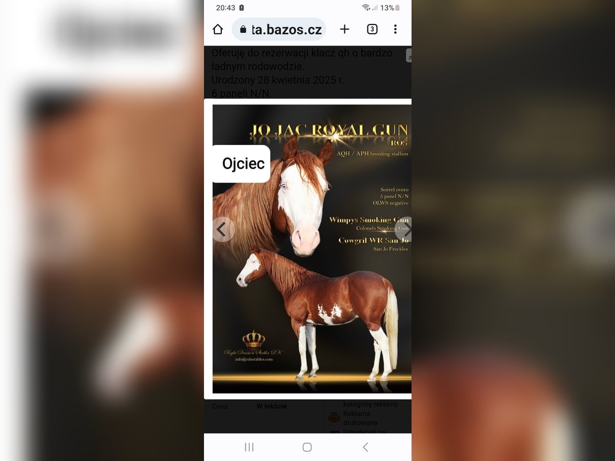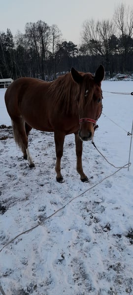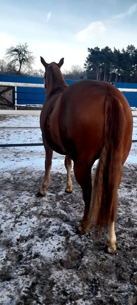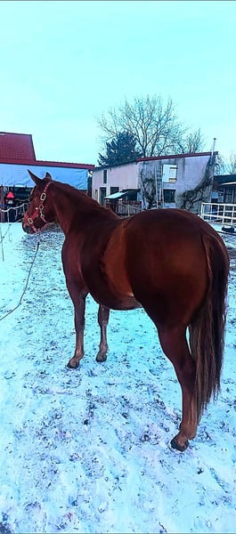 Zweijährige Quarter-Horse-Stute mit Trainingsabstammung. Sie hat Potenzial für den Hochleistungssport und eignet sich auch hervorragend als Familienpferd. Regelmäßig beschlagen, geimpft und entwurmt. Sie ist gut erzogen, leinenführig, respektvoll gegenüber ihrem Hirten, mutig, gesund und sehr kräftig gebaut. Aktuell ca. 138 cm groß, wächst sie noch 8 cm. Keine Mängel. Sie besitzt einen polnischen Pass und ein AQH-Prüfzertifikat. Sie lebt in der Nähe von Konin, Großpolen. Kontakt per Telefon oder WhatsApp: +49 664 550 570