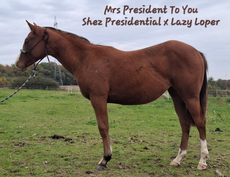 Mrs President To You ist eine bildhübsche Quarter Horse Stute, geboren am 28.06.2024 in der Farbe Bay, mit einem geschätzten Endmaß von ca. 156 cm. Die AQHA-Papiere liegen vor. Sie ist korrekt gebaut, gut entwickelt und ausgewogen bemuskelt, sodass sie später auch größere Reiter gut abdecken wird. Sie zeigt bereits jetzt sehr gute Grundgangarten und bringt damit beste Voraussetzungen für eine sportliche Zukunft mit. Sie stammt direkt von Lazy Loper ab, ihre Mutter, Shez Presidental hat 102 AQHA Punkte. Beide Elternteile wurden erfolgreich im Sport vorgestellt und verfügen über eine erstklassige Pleasure- und Allround-Abstammung. Damit eignet sich die Jungstute sowohl für die Turnierlaufbahn als auch für die Zucht oder als hochwertiger Freizeitpartner mit Perspektive für die Allround-Klassen. Die Stute ist gesund, regelmäßig entwurmt und steht alle vier Wochen beim Hufschmied. Sie besitzt eine sehr gute Hufqualität. Die Stute wächst im Herdenverband auf und kennt das Fohlen-1x1, ist halfterführig und altersgerecht erzogen. Sie ist 4-Panel n/n und GBED n/p. Charakterlich zeigt sie sich sehr lieb, menschenbezogen und neugierig, sie möchte gefallen, lernt schnell und ist im Umgang brav, kann altersbedingt aber auch mal frech werden. Daher wünscht sie sich einen erfahrenen Menschen, der sie weiterhin altersgerecht fordert und fördert. Ob zukünftiges Showpferd oder verlässlicher Freizeitpartner - mit ihrem Potenzial für die Allround-Klassen ist Mrs President To You ein echtes Versprechen für die Zukunft.
