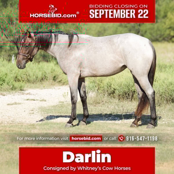 🍁𝒕𝒉𝒆 𝐅𝐀𝐋𝐋 𝑺𝒑𝒆𝒄𝒕𝒂𝒄𝒖𝒍𝒂𝒓🍁 Happening now thru MONDAY | SEPTEMBER 22nd - Available EXCLUSIVELY on HorseBid's website! For more details and to register visit: www.Horsebid.com CONSIGNOR CONTACT: Whitney’s Cow Horses 916-547-1198 LOCATION: Graham, TX BREED: Aqha REGISTERED: No COLOR: Bay Roan HEIGHT: 14.2 AGE: 2 GENDER: Filly “Darlin” is a 2 year old filly that is nice to look at and even better to ride! We have owned this mare for about a year now and she has been a pleasure to have around. She will work a cow/flag, drag calves, sort pairs and I have even gathered llamas on her. Darlin lopes beautiful, low headed circles and has a strong stop. She is quick footed, snappy and smooth. This filly has a lot of class to her and she will turn heads anywhere and everywhere she goes. Although she sells grade, she is sired by a running horse stud and out of a cow horse mare. For just a 2 year old (coming 3 in January), Darlin has seen the sights, been there, done that. She is of sound mind and body. This horse could truly go on to do whatever you wanted. Call Whitney at (916)547-1198 with any questions or if you’d like to come try Darlin.