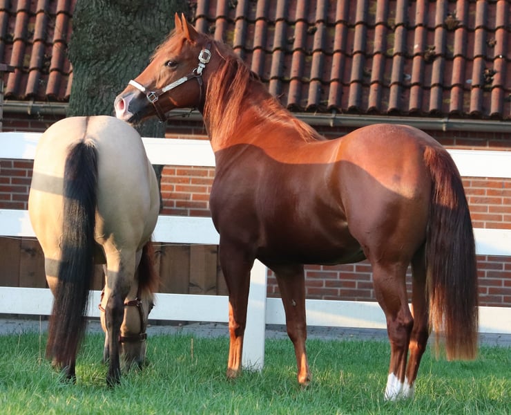 Sita, une jeune jument Quarter Horse prometteuse, à donner à des mains aimantes Sita est une jument Quarter Horse née en 2022, qui séduit par son tempérament équilibré et sa nature amicale. Elle est fiable dans sa manipulation et connaît les bases du quotidien. Nettoyage, conduite à la longe, attache ainsi que le nettoyage des sabots lui sont familiers et ne posent aucune difficulté. Elle se montre attentive, calme et proche de l’humain. Actuellement, Sita n’a pas encore commencé son dressage monté et n’est pas encore montée. Elle offre ainsi d’excellentes conditions pour une personne souhaitant l’éduquer selon ses propres idées – que ce soit en autonomie ou avec un accompagnement professionnel. Grâce à sa nature ouverte et agréable, elle possède toutes les qualités pour devenir une partenaire fiable. Elle recherche une place auprès de personnes responsables, qui prennent plaisir à accompagner et à former un jeune cheval étape par étape. Si vous cherchez une jeune jument sympathique, avec de solides bases, Sita sera une compagne formidable pour l’avenir. Si vous recherchez un jeune cheval qui séduit par son caractère, son talent et son cœur, Sita pourrait bien être la partenaire idéale pour vous. Vous pouvez nous trouver à Oberlangen, 49779. Je vous communiquerai volontiers l’adresse exacte après un entretien personnel. Vous pouvez me joindre au 0162 4348386.
