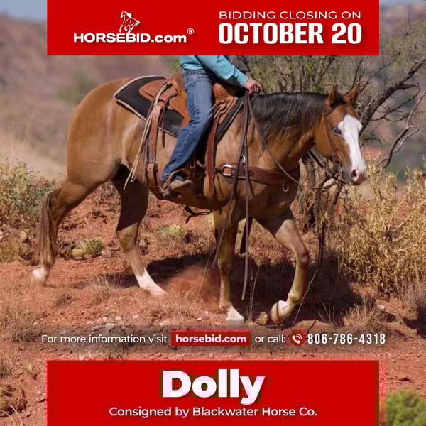 ♦️ 𝐭𝐡𝐞 𝐀𝐌𝐄𝐑𝐈𝐂𝐀𝐍 𝓕𝓪𝓵𝓵 𝓒𝓵𝓪𝓼𝓼𝓲𝓬 ♦️ Happening now thru MONDAY | OCTOBER 20th - Available EXCLUSIVELY on HorseBid's website! For more details and to register visit: www.Horsebid.com CONSIGNOR CONTACT: Blackwater Horse Co. 806-786-4318 LOCATION: Canyon Tx BREED: Quarter horse REGISTERED: Yes REGISTERED NAME: Dolly Dunit For Cash COLOR: Dun HEIGHT: 15 AGE: 4 GENDER: Mare Dolly is a beautiful 4-year-old mare with outstanding potential and the temperament everyone looks for. Double registered and bred to excel, she combines quality bloodlines with a kind, willing disposition that makes her a joy to be around. This young mare is gentle, quiet, and easy handle in every way. Her calm and soft demeanor allows her to take new experiences in stride. Dolly is exceptionally versatile — she has the foundation to go in any direction, whether you’re looking for a dependable ranch partner, a future show prospect, or a trustworthy weekend horse. Dolly has a steady mind, soft handle, and a big heart — the kind that’s hard to find and easy to love. If you’re searching for a young, double registered mare with talent, temperament, and endless potential, Dolly is one you don’t want to miss.