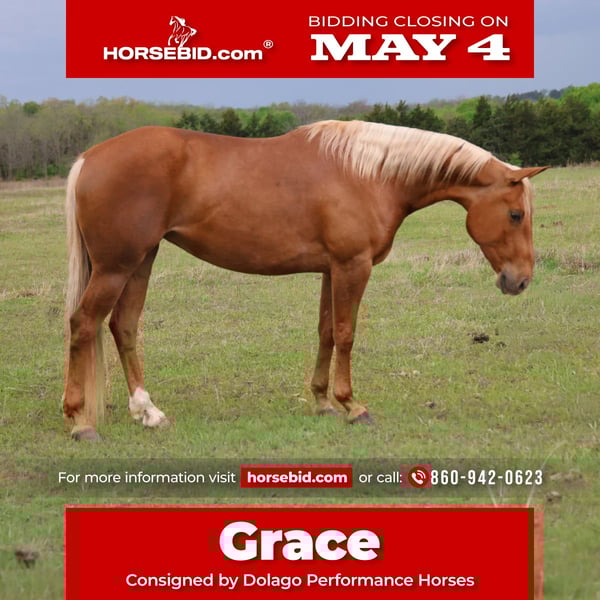 ▪️▫️◾️𝐭𝐡𝐞 𝑴𝒂𝒚 𝐒𝐞𝐥𝐞𝐜𝐭◾️▫️▪️ Happening now thru MONDAY | MAY 4th - Available EXCLUSIVELY on HorseBid's website! For more details and to register visit: www.Horsebid.com CONSIGNOR CONTACT: Dolago Performance Horses 860-942-0623 LOCATION: Ripley, OK BREED: QH REGISTERED: Yes REGISTERED NAME: CUTTER EYES COLOR: Palomino HEIGHT: 15 AGE: 4 GENDER: Mare Take a look at this pretty lady! This is grace a 4 yr old GOLDEN palomino mare who stands 15 hands and weighs 1050 lbs. You can’t beat this mares looks… she’s a golden shapey palomino mare who was built correct with a big hip, clean legs, and thick boned. She is absolutely stunning and the kind that turns heads everywhere she goes. What’s on the inside is just as impressive. She is broke, rides beautifully, and has a smooth, effortless way of going that truly makes her feel like a cloud to ride. She’s soft, willing, and easy to operate, making her a great fit for just about anyone. She rides level headed with a great stop and turnaround. Whether you’re an experienced rider or just looking for something safe and enjoyable, she’s the type you can climb on and immediately get along with. This mare has zero spook and is as honest as they come. She’s a true trail horse that will go anywhere you point her without hesitation through brush, water, rough country, or new environments, she never looks at anything and always takes care of her rider. She’s spent a full summer being used on the ranch, handling long, hard days with ease. She’s been used as well for many long days on the feed lot sorting and handles them great! She has the stamina, mindset, and work ethic to get a job done, yet remains gentle and dependable every single ride. Her personality is hard to beat she’s kind, enjoys attention, and truly likes being around her person. She’s not marish at all and is easy to have around in every way. On top of that, she’s an easy keeper that stays in great shape without needing extra fuss. You won’t stress when owning this mare. If you’re looking for a drop dead gorgeous, gentle, no nonsense mare that anyone can enjoy and trust, she is the total package.