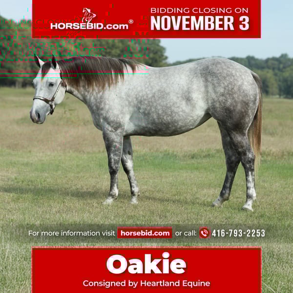 ⚜️𝐓𝐇𝐄 𝐅𝐀𝐋𝐋 𝐇𝐄𝐑𝐈𝐓𝐀𝐆𝐄 𝐂𝐋𝐀𝐒𝐒𝐈𝐂⚜️ Happening now thru MONDAY | NOVEMBER 3rd - Available EXCLUSIVELY on HorseBid's website! For more details and to register visit: www.Horsebid.com CONSIGNOR CONTACT: Heartland Equine 416-793-2253 LOCATION: Mt Vernon, MO BREED: Quarter horse REGISTERED: Yes REGISTERED NAME: JBC Canzan Suneystar COLOR: Grey HEIGHT: 14.3 AGE: 4 GENDER: Mare This young mare has size, brains & bright future ahead of her! “Oakie” is a 4 year old registered AQHA mare standing 14.3 hands. She is kind and easy to be around. Oakie is soft in the face, light in your hands and is uncomplicated to ride. She has been started right and in good hands throughout her training.She picks up all gaits and leads, lopes beautiful circles. This beautiful grey mare has the foundation to pick-up the career of your choosing! Oakie has been rode both in and out of the arena, alone or in a group. She has been used to gather cattle, rode through town and down trails. She has been exposed to and seen just about everything, nothing phases this level headed mare. She is an in your pocket type horse, loves people and attention. No bad habits. Leads, loads, ties and has impeccable manners. Oakie is heavy made and hearty with big solid feet. She is sound, sane and ready to move into your barn!