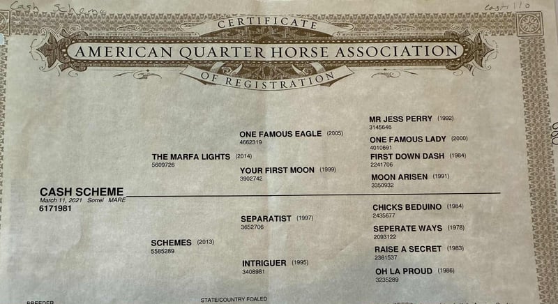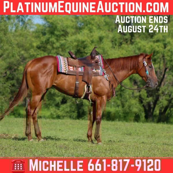 ONLINE AUCTION Place your bids at www.PlatinumEquineAuction.com Starting Bid $3500 Auction ends August 24th, 2025 Need a new saddle? Check out White Rock Saddles on our website or Facebook Wow! Let me introduce you to an exceptional mare that’s sure to steal your heart—meet Cash Scheme! This stunning 2021 AQHA mare is everything you could wish for in your next equine partner. With her perfect confirmation, beauty, brains, and an incredible pedigree filled with winners, she truly stands out from the crowd. Sired by The Marfa Lights, who boasts an impressive $566,493 in earnings and a second-place finish at the All American Futurity, Cash Scheme comes from a lineage that’s packed with racing champions. Standing at a striking 16 hands, she’s not just a pretty face; she’s got the performance to back it up. Although she’s had a brief racing career, earning around $17,118 on the track, she’s ready to transition into her next adventure with you! Don’t let her racing background intimidate you—Cash Scheme is one of the sweetest and most willing mares you’ll ever meet. With a calm demeanor that shines both under saddle and on the ground, she’s eager to please and has a fantastic attitude. She glides through the arena, beautifully walking, trotting, and loping in perfect circles while always picking up the correct leads. We’ve taken her out on trails, and she’s proven to be a reliable partner, going wherever you point her. Whether you’re looking for a barrel horse, a rope horse, or a versatile ranch horse, Cash Scheme has the potential to excel in any discipline. With her flashy movement, she could also shine in the English arena, making her a fantastic candidate for hunter-jumper events. Cash Scheme is ready for someone to take her under their wing and make her their number one. Horses like her are a rare find, especially with her proven genetics. She stands tied, trailers well, is great for the farrier, and absolutely loves being spoiled. If you’re ready to welcome a classy and talented mare into your life, Cash Scheme could be the perfect match for you! Don’t miss out on the chance to own this remarkable girl! She is also eligible to be nominated to the RUBY BUCKLE incentive and several others. We are open to anyone interested in her to schedule a time to come see her or if you can’t make it schedule a FaceTime showing to see her. If you need help with transport don’t hesitate to ask we have a list of reputable haulers that can get her safely to your doorstep WORLD WIDE including, Alaska , Mexico, Hawaii, Canada and anywhere in between from Stephenville, TX. For more info contact M$ Performance Horses Michelle 661-817-9120. ONLINE AUCTION Place your bids at www.PlatinumEquineAuction.com Starting Bid $3500 Auction ends August 24th, 2025 Need a new saddle? Check out White Rock Saddles on our website or Facebook