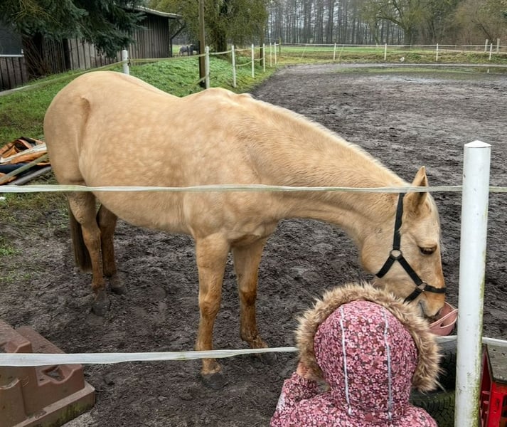 🌸 Hallo, ik ben Pepper – misschien wel jouw nieuwe beste vriendin? 🌸 Mijn naam is Peps Red Pepperoni, maar iedereen noemt me gewoon Pepper of Peps. Ik ben een 6-jarige Quarter Horse merrie in een prachtige palomino-vacht en heb een schofthoogte van ongeveer 147 cm. Ik heb al een basisopleiding genoten, leer heel graag nieuwe dingen en ben altijd blij als iemand met me bezig is. Ik ben leergierig, aandachtig en heb een zachtaardig karakter. Als er kinderen in de buurt zijn, snuffel ik nieuwsgierig en blijf ik heel braaf. Momenteel sta ik in een buitenstal, word ik regelmatig ontwormd en komt de smid elke 6 weken langs – dus ik ben uitstekend verzorgd. Mijn equidenpas neem ik natuurlijk mee. Helaas heeft mijn huidige eigenaar met drie kleine kinderen niet genoeg tijd voor mij. Daarom zoek ik nu een persoon die zin heeft om samen met mij verder te gaan en me te ondersteunen. ✨ Ik wens een liefdevol thuis waar ik kan laten zien hoeveel plezier ik kan brengen. Misschien bij jou? ✨ 📩 Als je me wilt leren kennen, kijk ik uit naar je bericht!