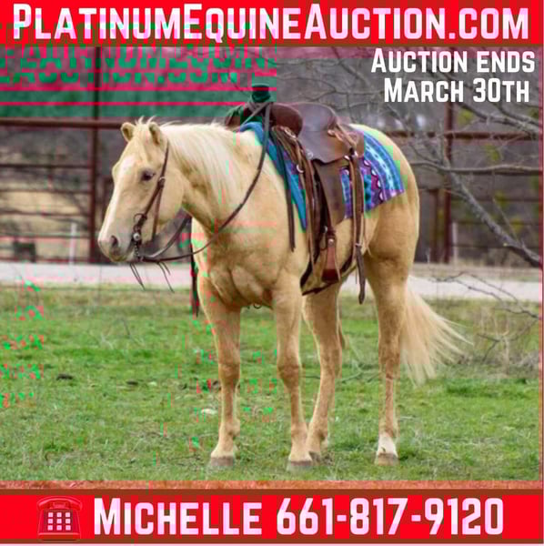 ONLINE AUCTION Place your bids at www.PlatinumEquineAuction.com Starting Bid $3500 Auction ends March 30th, 2025 Need a new saddle? Check out White Rock Saddles on our website or Facebook! Meet Frosty, the adorable little mare who’s ready to steal your heart! At just 5 years old and standing at 14.1 hands tall, she’s as sturdy as she is charming. With her cute frostbit ears and her fun personality, Frosty is sure to bring a smile to your face! Frosty is a seasoned trailblazer who loves hitting the trails. She’s seen plenty of sights around town and handles traffic, crowds, and even loud music like a pro. Just recently, she was the star of the show at the historic Fort Worth Stockyards, soaking up attention and loving all the pets from people passing by. She patiently stood during the cattle drive, showcasing her calm demeanor right on the famous bricks of Exchange Ave. This sweet mare has a wonderful, laid-back attitude and a strong desire to please. Wherever you point her, she’s happy to go! She’s been on numerous trail rides at the National Parks and is a total joy to ride. Frosty tackles hills of all sizes with ease and isn’t afraid to cross water, bridges, or downed trees. With her heart of gold that matches her beautiful color, she truly is a cool little gal. Frosty can ride alone or in a group, making her a versatile companion. While she’s more whoa than go and not a speed demon, she will walk,trot and lope circles. She’s had experience moving cattle and horses between pastures, proving that no job is too big or small for her. This lovely mare adores attention and will happily fall asleep while you groom her. She’s great for baths, loads and unloads from the trailer without a fuss, and stands tied patiently. Tacking up is a breeze, making her a wonderful partner for all your adventures. Don’t miss out on the opportunity to bring this super cool little mare into your life! Frosty is ready to be your new best friend and adventure buddy! Please don’t hesitate to give us a call to come meet her or if you aren’t able to do that we do offer FaceTime showings. If you need help with transport don’t hesitate to ask we have a list of reputable haulers that can get her safely to your doorstep WORLD WIDE including, Alaska , Mexico, Hawaii and Canada. For more info contact M $ Performance Horses Michelle 661-817-9120 Located in Stephenville, TX. ONLINE AUCTION Place your bids at www.PlatinumEquineAuction.com Starting Bid $3500 Auction ends March 30th, 2025 Need a new saddle? Check out White Rock Saddles on our website or Facebook!