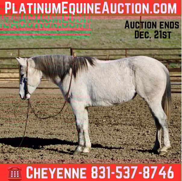 ONLINE AUCTION Place your bids at www.PlatinumEquineAuction.com Starting Bid $3500 Auction ends December 21st, 2025 Need a new saddle? Check out White Rock Saddles on our website or Facebook Tink is a 6-year-old grade grey mare standing at 14.2hh, and she is truly one of those horses that’s a pleasure to own and be around. She has a kind, gentle personality that makes her easy to handle on the ground and a confident, enjoyable partner under saddle. Tink has spent most of her life taking riders of all levels through a variety of trail conditions, both in groups and alone. She has seen traffic, wildlife, construction equipment, water crossings, bridges, and just about anything else you can find outside—and she handles it all with a calm, steady attitude. Under saddle, Tink is coming along beautifully in the arena. She knows her leads, has smooth, comfortable gaits, and offers a light stop with a collected reverse. She stays patient, honest, and willing, without ever getting fresh or reactive. There’s no spook, no attitude, and no bad habits—just a reliable young horse with a mature mind. Tink has also spent time out on the ranch moving cows, and she genuinely enjoys working around them. She ties well, hauls without issue, and gets along with other horses, making her a versatile and uncomplicated addition to any program. With her level head, sweet temperament, and “old soul” feel, Tink is a young mare with her whole future ahead of her, ready to go in any direction you choose. She’s the kind of horse you can trust, enjoy, and build on for years to come. She is located in Bitterwater, CA. for more info contact Cheyenne Rey at 831-537-8746. ONLINE AUCTION Place your bids at www.PlatinumEquineAuction.com Starting Bid $3500 Auction ends December 21st, 2025 Need a new saddle? Check out White Rock Saddles on our website or Facebook