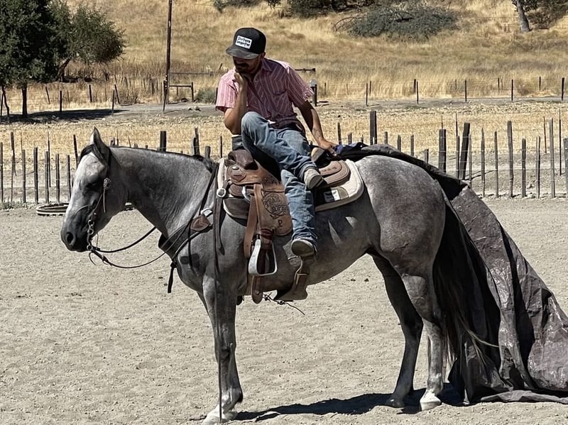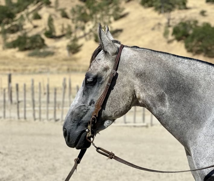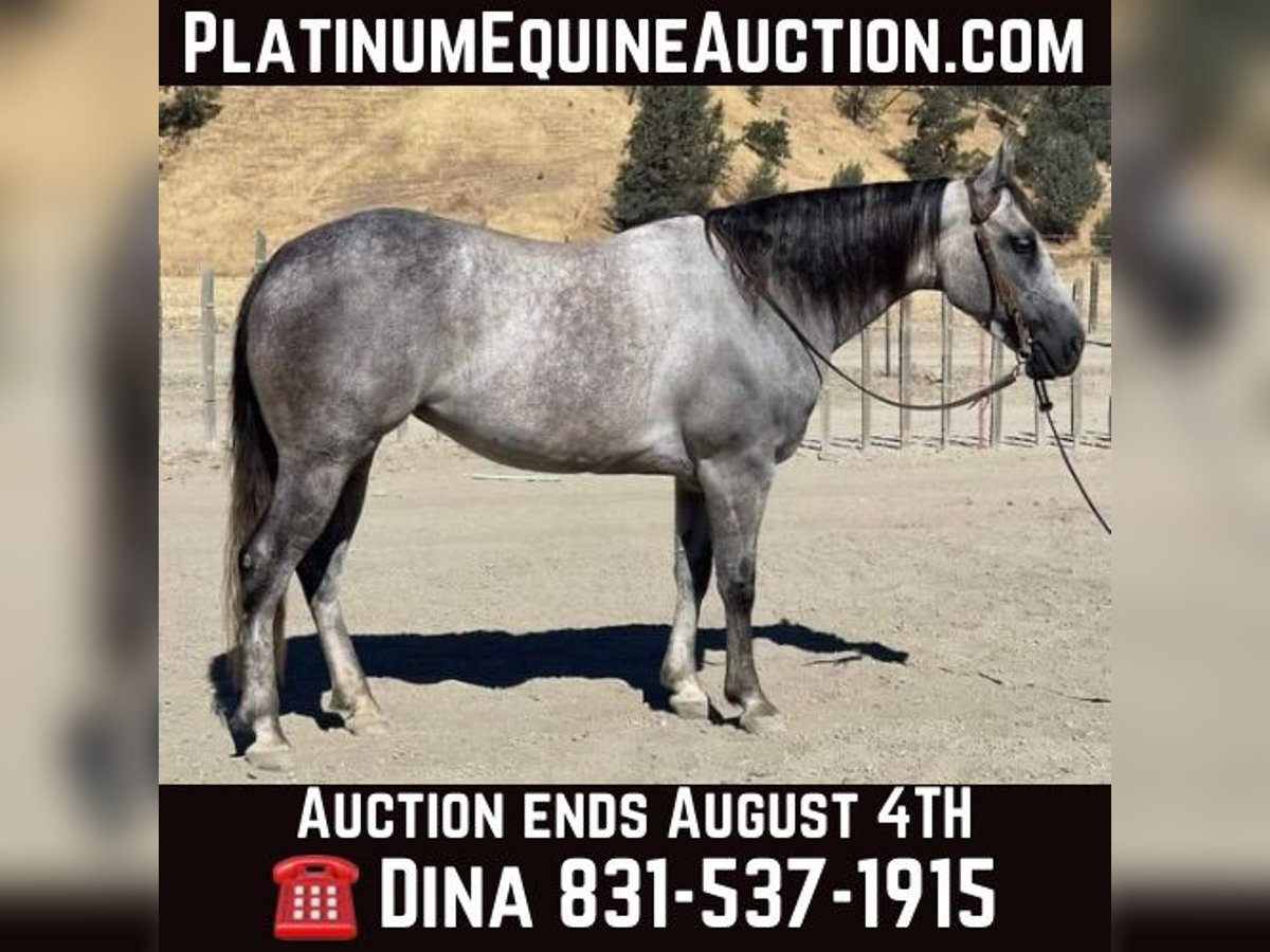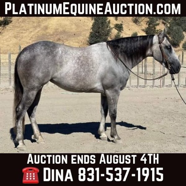 ONLINE AUCTION Place your bids at www.PlatinumEquineAuction.com Starting Bid $3500 Auction ends August 4th, 2024 Need a new saddle? Check out White Rock Saddles on our website or Facebook! A Smurfette is a gorgeous grey mare! Smurfette checks every box you can think of. Quality defines this beautiful 5 year old mare standing 15 hands and everyone’s favorite color grey she’s literally almost blue. She is safe, sane and very calm in every aspect. Her ground manners are impeccable always sweet and respectful. She likes to be groomed and is easy to tack up. Smurfette has a solid reining foundation lopes soft, collected circles and has a soft supple face. She has the absolute best slow lope that is to die for, easy to sit and smooth as glass. She has a nice easy turn around and stays right in between the reins. She is absolutely graceful and elegant. She has a soft easy to sit trot that you can ride for days. Smurfette has nice rollbacks and will side path to open and close gates with ease. She has been ridden out on the ranch and not much phases her. She is accustomed to wildlife, deep water, heavy brush and narrow trails. She is very surefooted and will take care of her rider in any situation. She is a very forgiving horse and a soldier on the trail. Smurfette is accustomed to busy traffic, bicycles, dogs, blowing tarps, bouncing balls, and heavy machinery. Smurfette has been desensitized to trail obstacles bridges, car wash, logs, and will try anything you ask her to. Smurfette is cowy and has done all the ranch duties. She would make a phenomenal rope horse. The best way to describe her is perfection! She is ready to be your next faithful companion. She has her whole life ahead of her and she is gonna shine no matter which direction you take her. Smurfette will be a great addition to any style ridding and will fit many different aspects as she is gentle reliable and safe. I really like this mare she is not your typical mare by any means she is the exception. She is not marish and acts just like gelding. Smurfette is ready to find her forever family and make all your dreams come true. She is up to date on shots, worming and farrier. She has no bad habits. Please contact Longhorn Ranch Dina 831-537-1915 Located in Paicines, CA. ONLINE AUCTION Place your bids at www.PlatinumEquineAuction.com Starting Bid $3500 Auction ends August 4th, 2024 Need a new saddle? Check out White Rock Saddles on our website or Facebook!