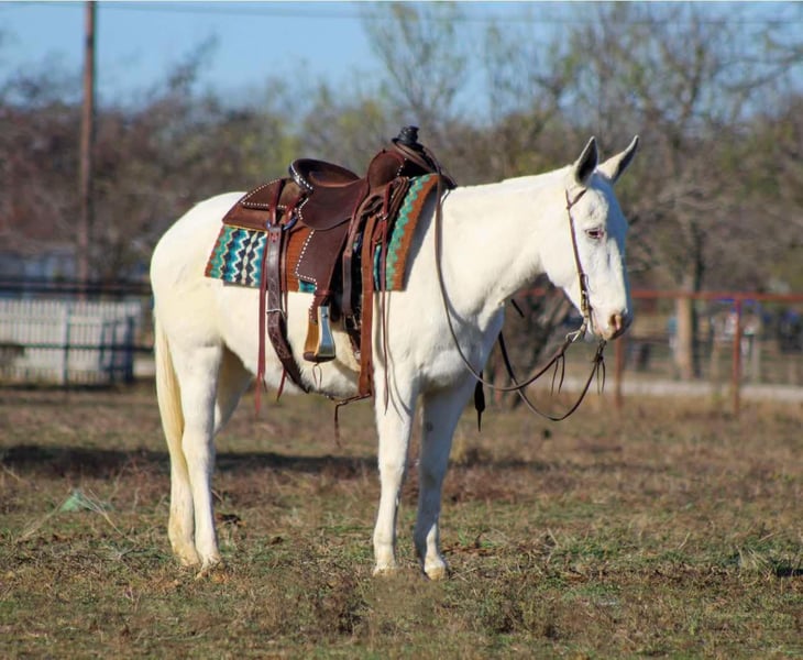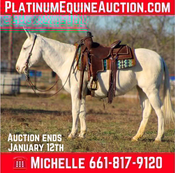 ONLINE AUCTION Place your bids at www.PlatinumEquineAuction.com Starting Bid $3500 Auction ends January 12th, 2024 Need a new saddle? Check out White Rock Saddles on our website or Facebook! Here’s one you won’t find anywhere else! Elsa is an incredibly loving 6-year-old mule standing 13.3 hds tall. Who stands out with her stunning grey and white sabino paint coat, which shines beautifully in the summer. She’s the kind of mule who’s always eager to please, ready to tackle any adventure you throw her way. Whether you prefer Western, English, or bareback riding, Elsa is up for it all! She has extensive trail riding experience, having navigated various terrains, including overnight camping trips in breathtaking national parks. Elsa confidently tackles hills, crosses downed trees, navigates water crossings, and even walks over bridges. Imagine a relaxing ride down the trail with a cold drink in hand—she makes it all the more enjoyable! Not only does Elsa shine on the trails, but she’s also been used for checking cattle and fences. She’s comfortable in busy environments too, having been ridden in town amidst traffic, crowds, and loud music without a care in the world. Elsa is barefoot and just had a trim, so her hooves are in great shape. She’s the first to greet you at the gate, whether in the pasture or her stall, and she’s easy to work with when it comes to grooming and tacking up. We’ve had countless adventures with Elsa, and we’re confident her new owners will love her just as much as we do! Don’t miss the chance to meet this incredible mule—check out her video and prepare to fall in love! Contact us to come try her or we can set up a FaceTime also M $ Performance Horses Michelle 661-817-9120 If you need help with transport don’t hesitate to ask we have a list of reputable haulers that can get her safely to your doorstep WORLD WIDE including, Alaska , Mexico, Hawaii and Canada. ONLINE AUCTION Place your bids at www.PlatinumEquineAuction.com Starting Bid $3500 Auction ends January 12th, 2024 Need a new saddle? Check out White Rock Saddles on our website or Facebook!