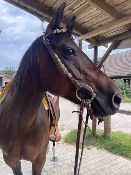 For sale is my reliable Quarter Horse mare Quincy Lady, 8 years old. ✨ Key Data: • Breed: Quarter Horse • Gender: Mare • Age: 8 years (February 19, 2017) • Height: 1.50m • Color: Bay ✨ Character & Training: Quincy Lady is a people-oriented, friendly mare with a balanced temperament. She is always attentive, easy to handle, and uncomplicated in her interactions. In training, she consistently shows motivation. However, she is not suitable for beginners, children, or insecure riders, as she still needs confidence from her rider. Special Features: • Good for the farrier and loading • Regularly vaccinated and dewormed • Healthy, only has a mild summer eczema, which can be managed with a fly blanket. • Also interesting for breeding - she had a foal at the age of 4. Location: 85309 Price: €10,000 (Her complete equipment can be purchased at a low price) Quincy Lady is looking for a loving home where she can continue to be developed and show her qualities. 3 current videos can be sent upon request. If interested or for more information, please feel free to contact me.