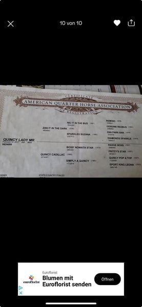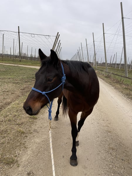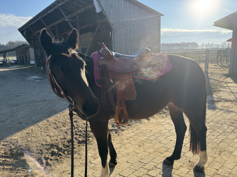 Zum Verkauf steht meine zuverlässige Quarter Horse Stute Quincy Lady, 8 Jahre alt. ✨ Eckdaten: • Rasse: Quarter Horse • Geschlecht: Stute • Alter: 8 Jahre (19.02.2017) • Stockmaß: 1,50m • Farbe: braun ✨ Charakter & Ausbildung: Quincy Lady ist eine menschenbezogene, freundliche Stute mit ausgeglichenem Temperament. Sie ist stets aufmerksam, gut zu händeln und unkompliziert im Umgang. Im Training zeigt sie sich stets motiviert. Sie ist dennoch nichts für Anfänger, Kinder oder unsichere Reiter, da sie einfach noch Sicherheit vom Reiter braucht. Besonderheiten: • brav beim Schmied und Verladen • regelmäßig geimpft und entwurmt • gesund, ledichlich leichtes Sommerekzem, welches aber mit der Fliegendecke zu Händeln ist. • auch interessant für die Zucht - hatte 4 jährig bereits ein Fohlen Standort: 85309 Preis 10.000€ (Ihr komplettes Zubehör kann günstig miterworben werden) Quincy Lady sucht ein liebevolles Zuhause, wo sie weiter gefördert wird und ihre Qualitäten zeigen darf. 3 aktuelle Videos können auf Wunsch versendet werden. Bei Interesse oder für weitere Informationen gerne melden.