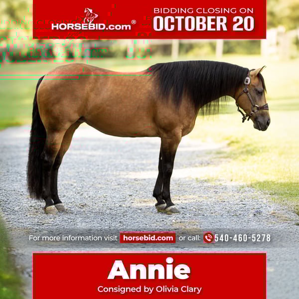 ♦️ 𝐭𝐡𝐞 𝐀𝐌𝐄𝐑𝐈𝐂𝐀𝐍 𝓕𝓪𝓵𝓵 𝓒𝓵𝓪𝓼𝓼𝓲𝓬 ♦️ Happening now thru MONDAY | OCTOBER 20th - Available EXCLUSIVELY on HorseBid's website! For more details and to register visit: www.Horsebid.com CONSIGNOR CONTACT: Olivia Clary 540-460-5278 LOCATION: Staunton, Va BREED: AQHA REGISTERED: Yes REGISTERED NAME: Whiskey Annie COLOR: Buckskin HEIGHT: 14.3 1/2 AGE: 7 GENDER: Mare Don’t miss this opportunity! Whiskey Annie is a 2018 buckskin mare by Whiskey N Diamonds. (Lifetime Earnings: $224,020 Sire Earnings: $3 Million+. 2011 NRHA OPEN DERBY CO-RESERVE CHAMPION 2012 AQHA WORLD CHAMPION SENIOR REINING HORSE 2011 NRHA FUTURITY OPEN RESERVE CHAMPION). She’s out of Super Olena Chic by AQHA Hall of Fame Sire, Smart Chic Olena. Annie, has earned herself over 65 AQHA points in Ranch Riding, working western rail and ranch trail, with fairly limited showing. Her earnings span from mostly open points to some select amateur and youth points as she has carried both select novice and youth riders. As a 3 year old Annie placed at the All American Quarter Horse Congress in the Junior Ranch Riding. She was the Reserve Champion in the Virginia Spring Break Out 4 & 5 Year Old Ranch Riding Stakes. This GORGEOUS, big bodied mare is a proven winner. She has easy, correct spins and auto flying lead changes. She wants to stop and has been exposed to cattle and the trail. She’s a point and shoot type ride with a natural level topline. Annie would make an excellent horse for most riders. Enjoy her as a using horse or return her to the show arena and breed her later. With her exceptional movement, looks, and pedigree, the options are endless. Watch her video!