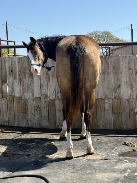🌟𝑨𝒑𝒓𝒊𝒍 𝐀𝐋𝐋 𝐒𝐓𝐀𝐑 𝐋𝐈𝐍𝐄𝐔𝐏🌟 Happening now thru MONDAY | APRIL 6th - Available EXCLUSIVELY on HorseBid's website! For more details and to register visit: www.Horsebid.com CONSIGNOR CONTACT: Florinia equine 572-205-5282 LOCATION: Edmond, OK BREED: Aqha REGISTERED: No COLOR: Buckskin HEIGHT: 15.2 AGE: 8 GENDER: Mare ble is an 8-year-old buckskin mare standing 15.2 hands tall, and she is the kind that checks all the boxes for a family looking for safety, quality, and eye appeal. With her bold blaze face, one blue eye, and flashy buckskin color, she is an absolute standout anywhere she goes. Sable is very gentle and has the kind of mind that makes her fit a wide range of riders. She is big enough for the husband to enjoy and safe enough for the children to feel confident on. She is the kind of mare that is simply handy to have around, whether you want to enjoy a quiet trail ride, take her to town, or have a dependable horse for the whole family to use. She is soft in the bridle, one-hand broke, and has a smooth, easy way of going. Sable will lope nice circles and rides around with a willing, user-friendly feel. Out on the trail, she is exactly what everyone wants — an amazing trail horse that will go through and over anything you point her at. She is confident, steady, and dependable in all kinds of country. Sable has also been ridden in grand entries and parades, giving her valuable outside experience and showing the kind of mind she has in busy atmospheres. She has been started on the head side and in breakaway, making her a fun option for someone wanting a versatile mare with more than just trail experience. She does have a scar on her front left leg, but it is purely superficial and causes her zero discomfort. It is only cosmetic and does not affect her in any way. If you are looking for a safe, gentle, flashy, below-budget mare that the entire family can enjoy, Sable is a hard one to beat. She is the kind that is attractive, broke, versatile, and dependable — all wrapped up in one beautiful package.